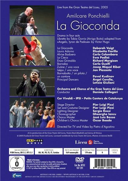 Arthaus presents a new production of La Gioconda recorded at the renowned opera house in Barcelona. The staging was realized in cooperation with the Arena di Verona and successfully shown in the famous opera festivals 2005 programme. The Barcelona production features internationally acclaimed singers as well as celebrated soloists and ballet dancers from the Gran Teatre del Liceu all showing a musically and dramatically impressive performance of this melodrama. The title role is sung by American soprano Deborah Voigt, one of the most important dramatic sopranos in her generation. Critics have praised her lyricism, beauty of tone and dramatic acuity and her impressive aura and voice. Polish contralto Ewa Podle appears as her blind mother, delighting the audience with the overwhelming warmth and broad range of her voice while convincingly conveying her characters suffering. The Canadian tenor Richard Margison takes the role of the exiled nobleman Enzo and the Italian baritone Carlo Guelfi sings the spy and agent provocateur Barnaba. Both excel opposite the two female characters. The ballet set to the famous Dance of the Hours deservedly received extended ovations. The choreography danced by two star dancers of the Barcelona ballet tells a love story in view of ongoing time, symbolised by the twelve hours. La Gioconda is a typical Romantic opera refl ecting various strands of 19th-century European melodrama. Even though it rests on the foundations of French grand opera, most obviously in its third-act ballet, the work follows the Italian and especially the Verdian tradition with its inspired arias, wonderful choruses and impressive orchestration. At the same time the vocal writing and a number of its dramatic effects point the way forward to verismo. The sets and costumes of the present production are the work of the distinguished Italian architect and director Pier Luigi Pizzi, whose staging is classical in its nobility.