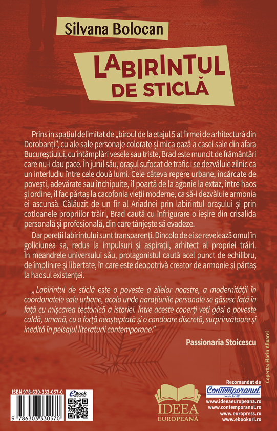 „Labirintul de sticlă este o poveste a zilelor noastre, a modernităţii în coordonatele sale urbane, acolo unde narațiunile personale se găsesc faţă în faţă cu mişcarea tectonică a istoriei. Între aceste coperți veți găsi o poveste caldă, umană, cu o forță neașteptată și o candoare discretă, surprinzătoare și inedită în peisajul literaturii contemporane.” -- Passionaria Stoicescu