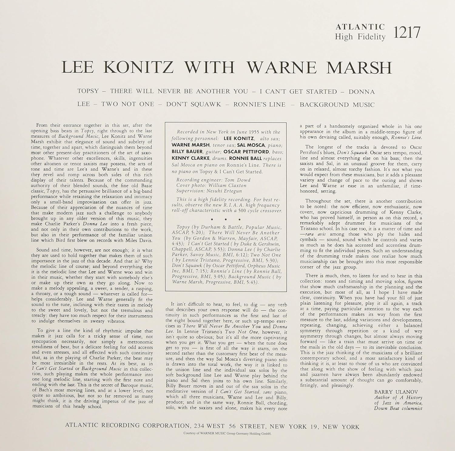 In June 1955, in the Atlantic studio, standards provided the starting base for the long and wonderfully sophisticated improvisations by Lee Konitz and Wayne Marsh, who were at that time pupils of the great Chicago maestro Lenni Tristano. Although the numbers are declared as own compositions, such as "Background Music" and "Ronnie's Line", they are actually none other than adaptations of "All Of Me" or "That Old Feeling" - but at the very highest level. Lee Konitz always called this 'The Twelfth Step'.