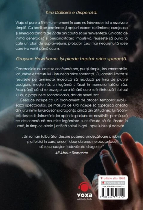 Obstacolele cu care se confruntă par, pur și simplu, insurmontabile, iar umbrele trecutului îi întunecă orice speranță. Cu capital limitat și resursele pe terminate, încearcă să readucă pe linia de plutire podgoria moștenită, un legământ făcut în memoria tatălui său. Asta până când se trezește cu o tânără care se înființează în biroul lui cu o propunere scandaloasă, dar de nerefuzat. Ceea ce începe ca un aranjament de afaceri temporar evoluează spectaculos, pe măsură ce Kira începe să topească gheața din jurul inimii lui Grayson și aroganța cinică din atitudinea lui. Scânteile ieșite din înfruntările lor aprind o pasiune de nestăvilit, pe măsură ce descoperă că anumite legăminte sunt făcute să fie lăsate în urmă, în timp ce altele justifică saltul în gol... spre iubire și adevăr.