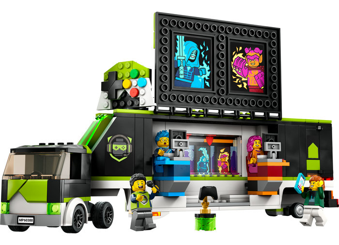 - Ce este în cutie? – Tot ce le este necesar copiilor pentru a crea un Camion pentru turneul de gaming cu o scenă, 2 stații de gaming și ecran de stadion, precum și un trofeu pentru câștigător, produse promoționale și 3 minifigurine