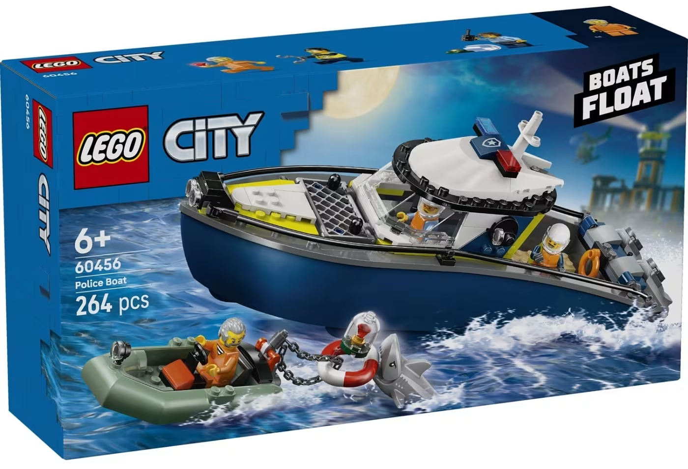 - Ce este în cutie? – Tot ce au nevoie copiii pentru a construi o barcă de poliție, o barcă gonflabilă cu motor a infractorului, precum și 2 minifigurine agenți de poliție, o minifigurină infractor și o figurină rechin
