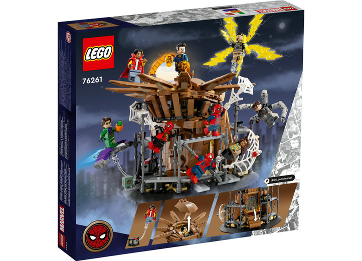 Acest set de 360 de grade include o varietate uimitoare de minifigurine LEGO Marvel, între care 3 versiuni ale Omului Păianjen: Friendly Neighborhood Spider-Man (Tobey Maguire), Uimitorul Om Păianjen (Andrew Garfield) și Omul-Păianjen (Tom Holland). Celelalte minifigurine sunt Electro, Doctor Strange, Green Goblin, Ned, MJ și Doc Ock. Setul conține numeroase dotări pentru a oferi cât mai multe posibilități de joacă și etalare, între care 3 suporturi de minifigurine pentru acțiune în aer, un acoperiș detașabil care dezvăluie mâna lui Sandman, o zonă de acces prin spate către un portal și un element pânză moale care înfășoară minifigurinele. Pentru mai multă distracție digitală, constructorii pot apropia, roti seturile în 3D și-și pot monitoriza progresul folosind aplicația distractivă și intuitivă LEGO Builder.
