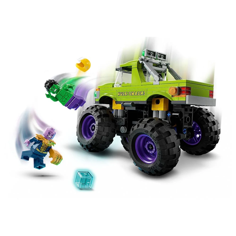 Acest solid vehicul LEGO Marvel construibil este insotit de o minifigurina Hulk cu casca detasabila si o minifigurina Thanos cu un cub Tesseract si o Manusa a Infinitului.