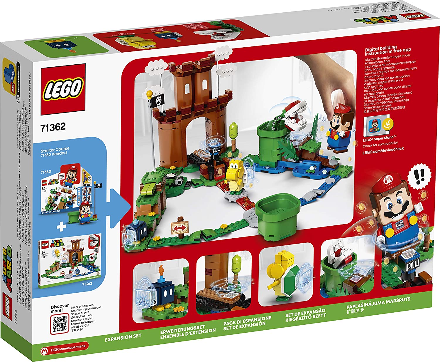 Copiii isi aleg ruta pe care o va aborda LEGO Mario pentru a ajunge la Cetatea pazita, cu acest Set de extindere cu distractie din plin (71362). Un cadou fantastic pentru copiii care au deja Setul de baza LEGO Super Mario (71360), include o cetate construibila, catapulta, rute de apa si lava din caramizi si blocul POW, plus figurinele jucarii Bob-omba, Koopa Troopa si Planta piranha, pe care LEGO Mario trebuie sa le infranga. (Nota: figurina Mario LEGO nu este inclusa; o gasesti in Setul de baza.)