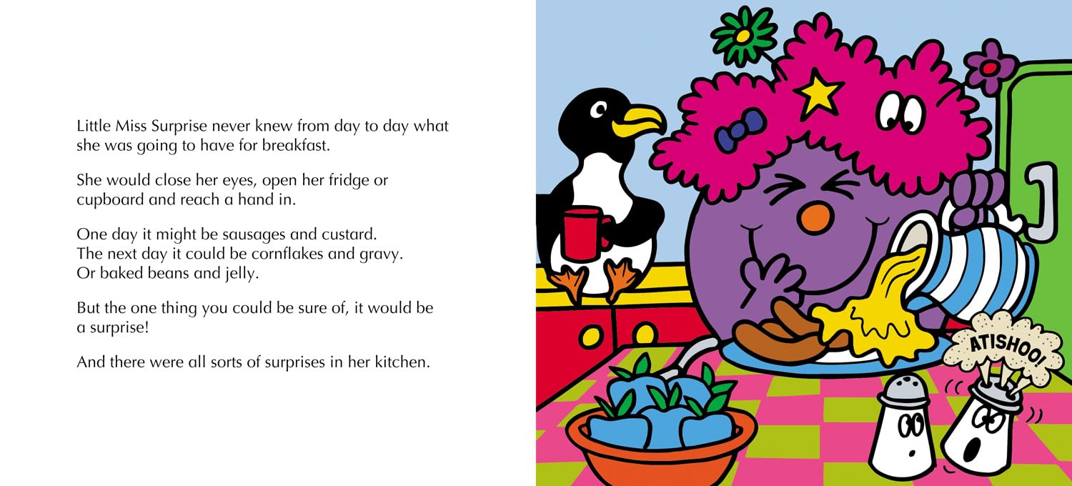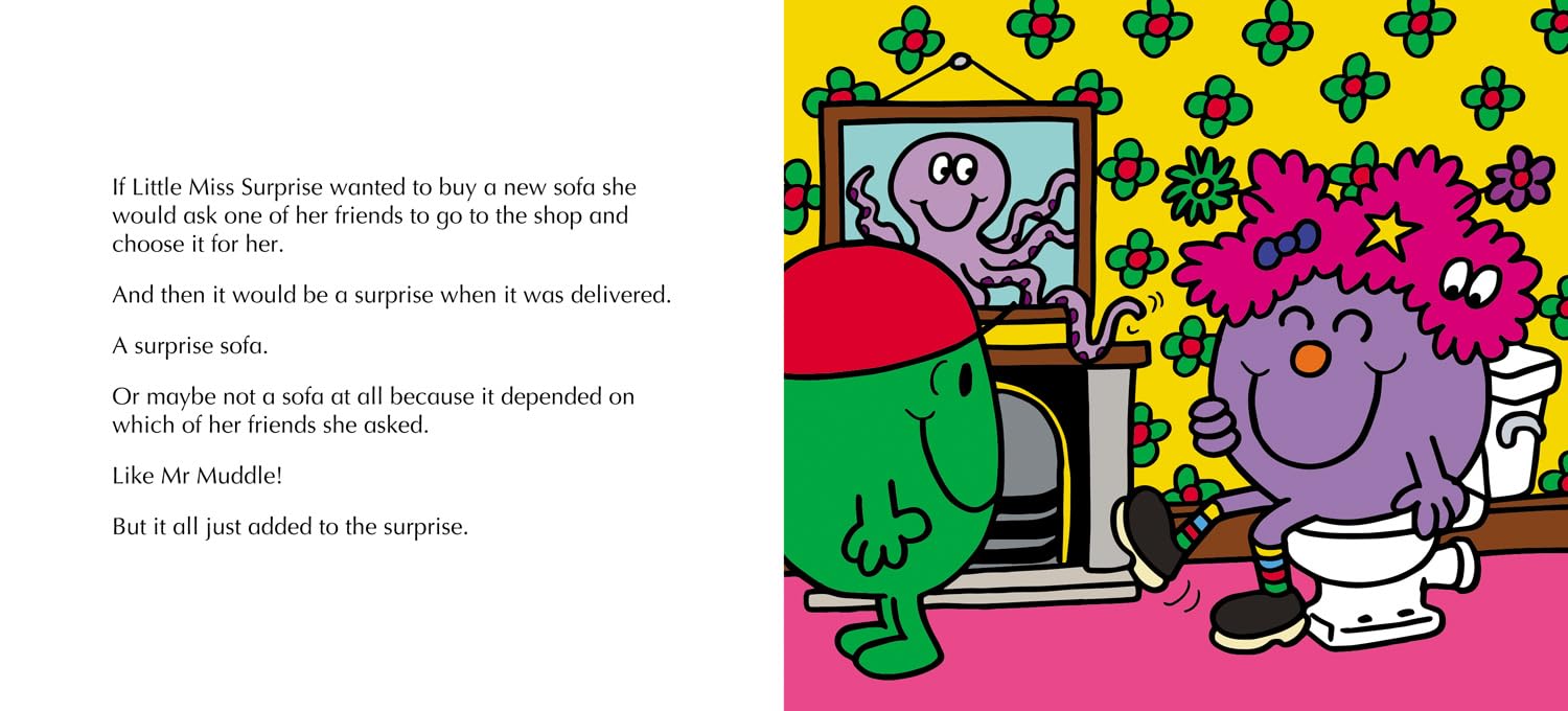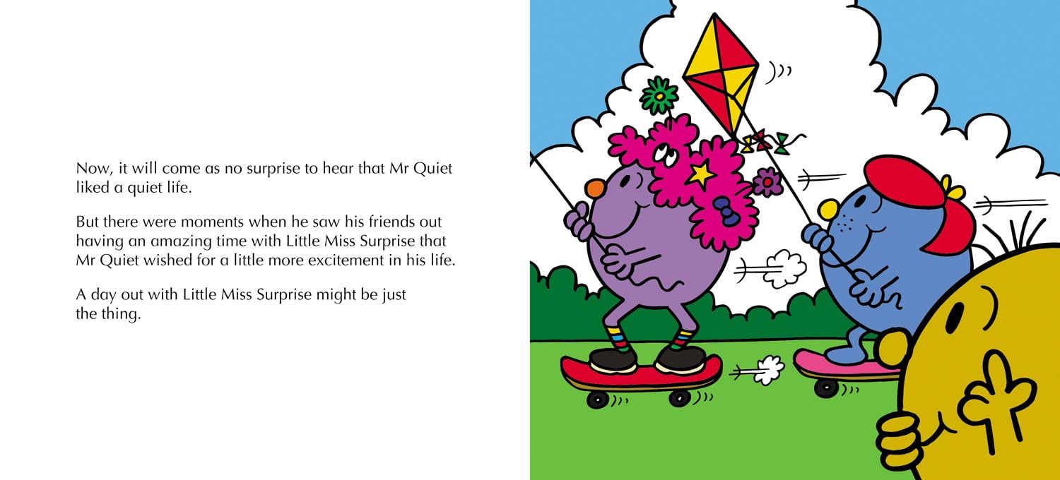 Meet the newest Little Miss who loves nothing better than surprises! Little Miss Surprise never knows from day to day what she’s going to do and who’ll she’ll do it with. Life certainly isn't predictable when Little Miss Surprise is around! But is Mr Quiet ready for one of her surprising days out?