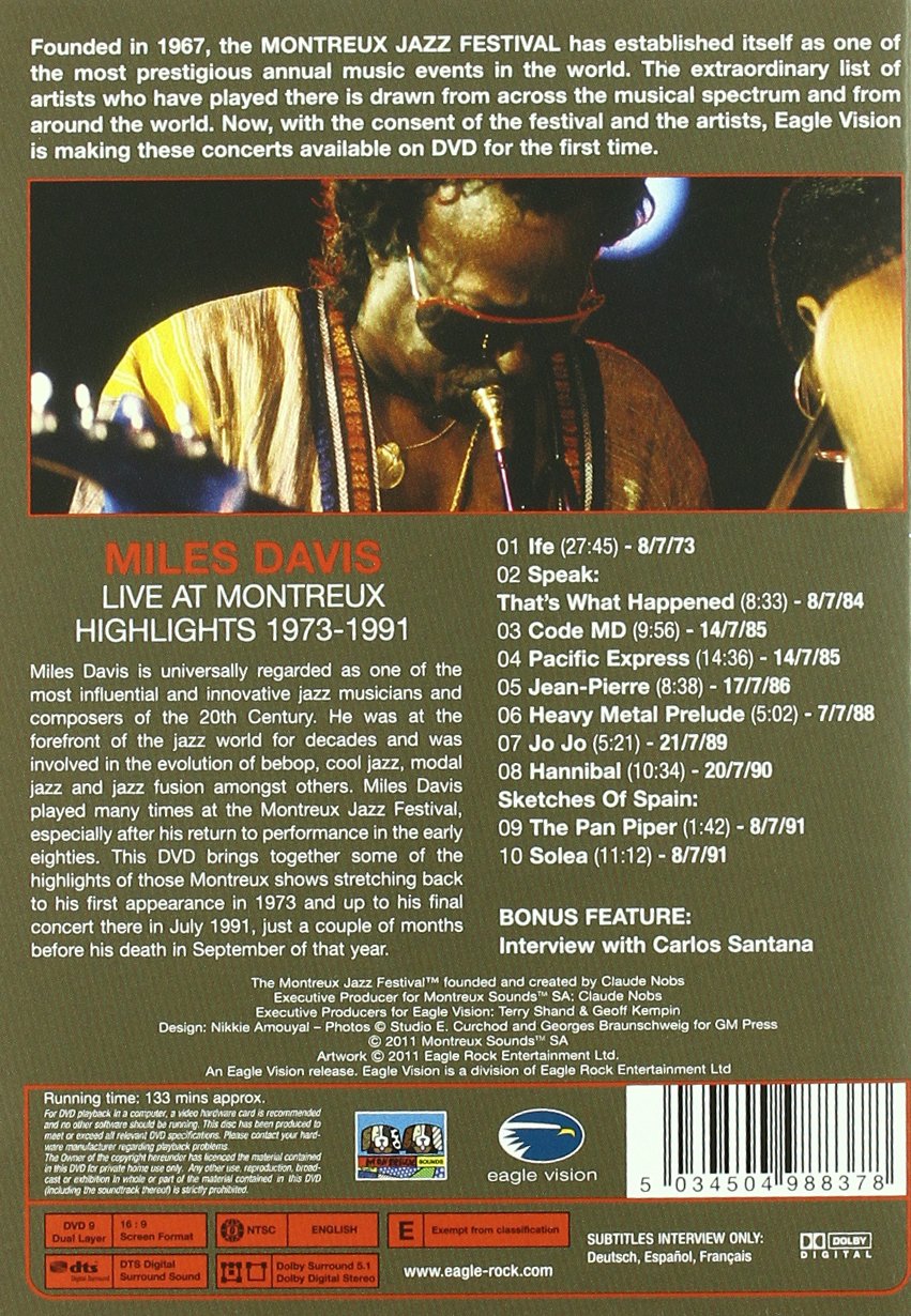 Miles Davis is universally regarded as one of the most influential and innovative jazz musicians and composers of the 20th Century. He was at the forefront of the jazz world for decades and was involved in the evolution of bebop, cool jazz, modal jazz and jazz fusion amongst others. Miles Davis played many times at the Montreux Jazz Festival, especially after his return to performance in the early eighties. This DVD brings together some of the highlights of those Montreux shows stretching back to his first appearance in 1973 and up to his final concert there in July 1991, just a couple of months before his death in September of that year.