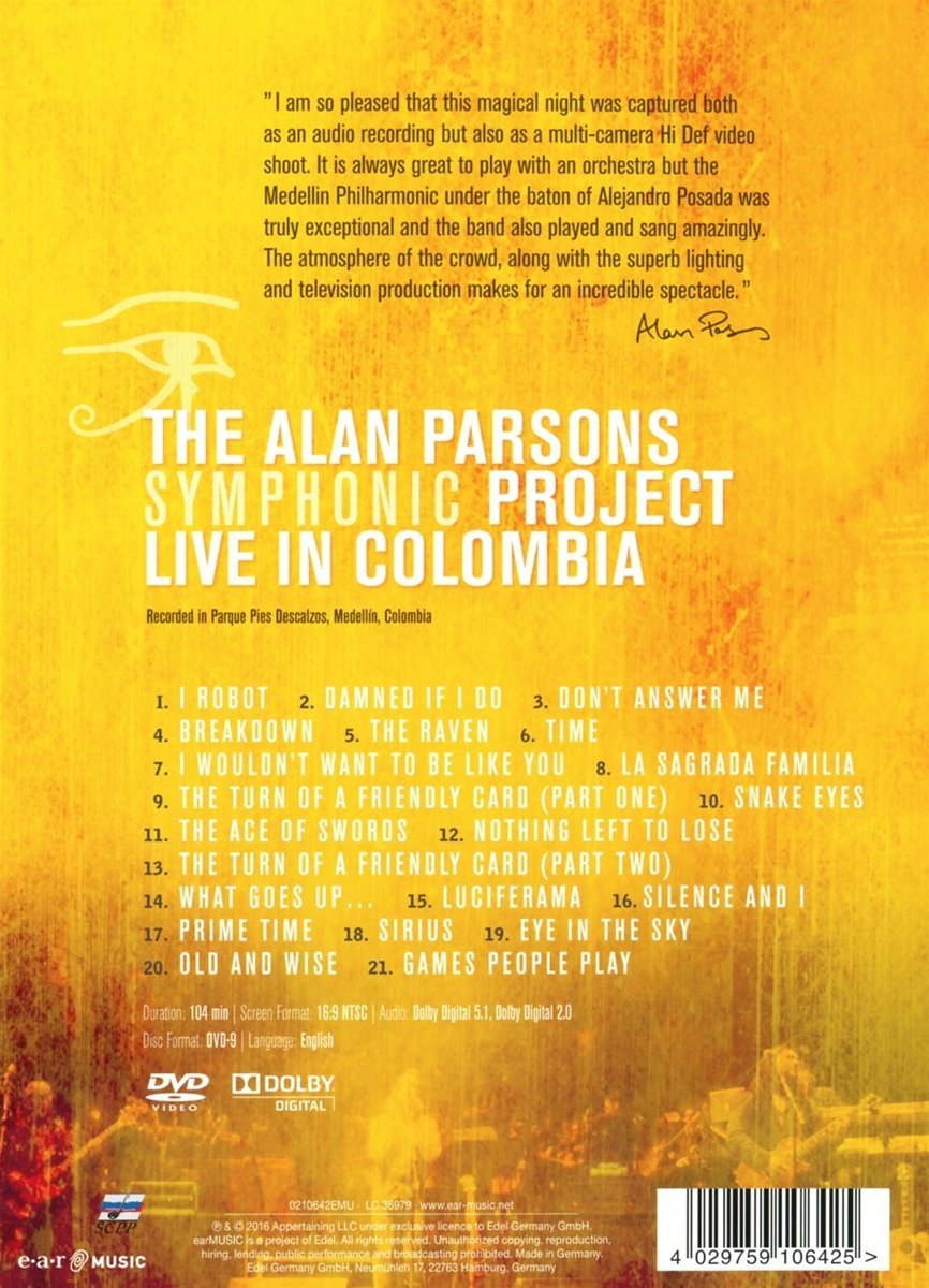 THE ALAN PARSONS SYMPHONIC PROJECT "LIVE IN COLOMBIA" On the evening of August 31st, 2013, a large crowd gathered at Parque Pies Descalzos in Medellín, Colombia. When Alan Parsons appeared on stage, along with the Medellín Philharmonic Orchestra and his band the audience went wild. This is an audio visual document of that incredible evening. Alan Parsons was 19 years old when he landed a job at the world famous Abbey Road Studios, an important first step on his journey to becoming a world class engineer, producer and artist. Following his beginnings with George Martin and The Beatles, his contribution to Pink Floyd's classic 'The Dark Side Of The Moon' earned him worldwide attention. As a producer he had many hits with Pilot, John Miles, Ambrosia and Al Stewart. Together with his manager and creative partner at the time, Eric Woolfson, he developed the Alan Parsons Project. The lineup consists of Alan Parsons on acoustic guitar, keys, and vocals, P. J. Olsson (lead vocals), Alastair Greene (guitar, vocals), Guy Erez (bass, vocals), Danny Thompson (drums, vocals), Tom Brooks (keyboards, vocals) und Todd Cooper (saxophone, guitar, percussion, vocals). Alejandro Posada conducts the Medellin Philharmonic Orchestra