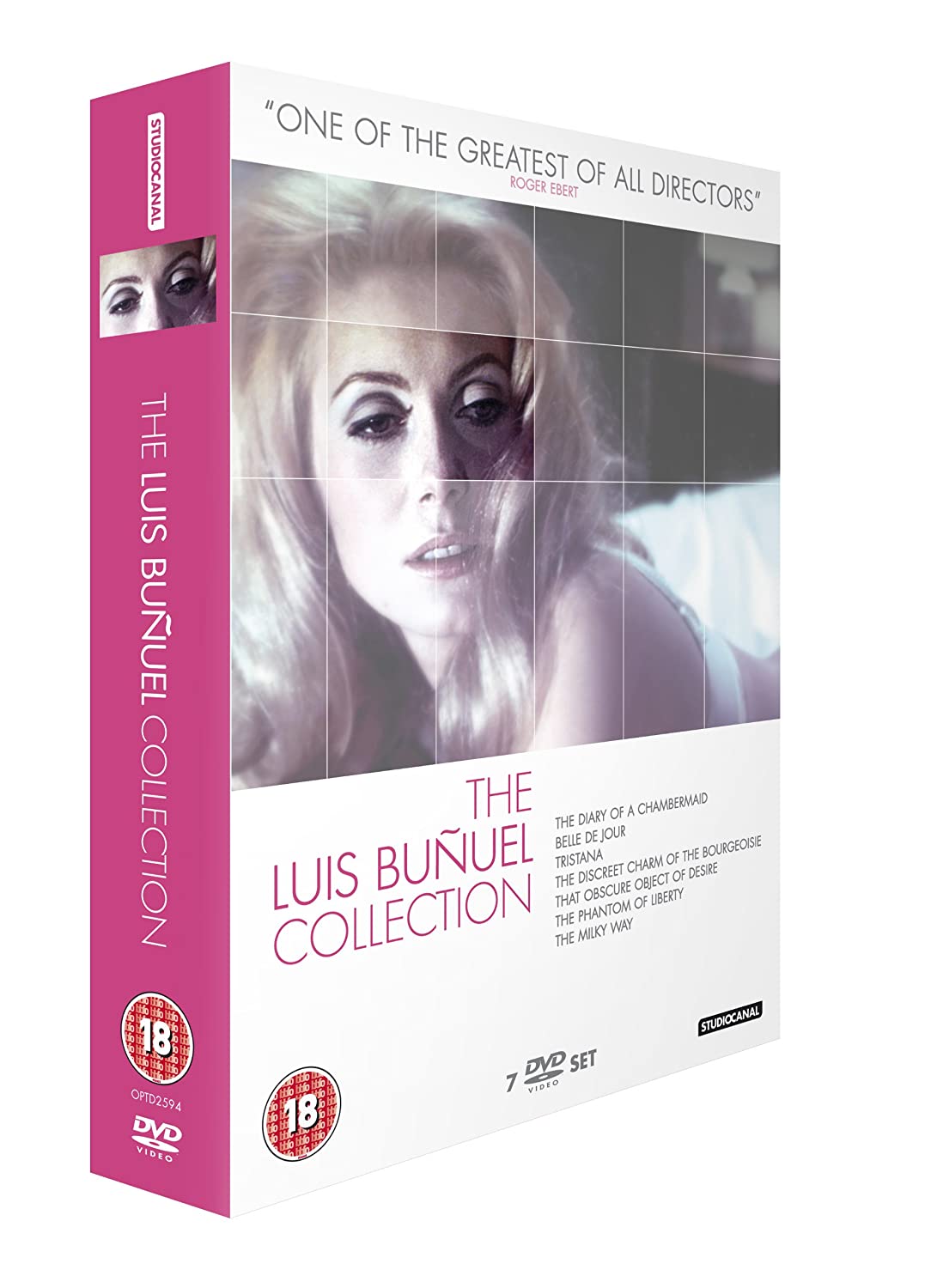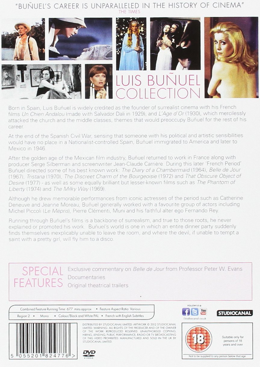 Collection of seven films by Spanish film-maker Luis Buñuel. In 'The Diary of a Chambermaid' (1964) Jeanne Moreau stars as Celestine, a beautiful and sharp-witted young maid from Paris who arrives to work on the rural Normandy estate of the wealthy Monsieur Rabour (Jean Ozenne). It's not long before Celestine clashes with her supervisor Joseph (Georges Géret), who rules the servants with intimidation and colludes with his bourgeois employers to serve his own interests. In 'Belle De Jour' (1967) bored doctor's wife Séverine Serizy (Catherine Deneuve) hears of a brothel operating near her home and, struck by a sudden desire, goes there to offer her services in the afternoons. While there she encounters a wide range of characters, only to eventually run into trouble with a gangster and a friend of her husband. 'Tristana' (1970) follows a young devout woman who goes to live with her male guardian after her mother's death. His intentions towards her are clearly more than fatherly, however, leading to an enforced marriage and Tristana (Deneuve) eventually fleeing to Madrid, where she falls in love with a young artist. Years later, afflicted with a life-threatening illness, she plots revenge against the man who had stripped her of her innocence. In 'The Discreet Charm of the Bourgeoisie' (1972) well-to-do couple the Thévenots (Paul Frankeur and Delphine Seyrig) accompany friends Rafael Acosta (Fernando Rey) and Florence (Bulle Ogier) to the house of Henri and Alice Sénéchal (Jean-Pierre Cassel and Stéphane Audran), who are hosting a dinner party. So begins a series of increasingly bizarre episodes and surreal dream sequences as the diners, over the course of the following days, find themselves repeatedly frustrated in their attempts at eating out. In 'That Obscure Object of Desire' (1977), Mathieu (Rey), a widowed French businessman, becomes obsessed with a Spanish girl named Conchita (Carole Bouquet and Angela Molina). She claims to feel the same for him but nevertheless continually frustrates the realisation of his desire. 'The Phantom of Liberty' (1974) begins with a man who falls in love with a statue during the Napoleonic wars and then moves to the modern day, where we meet a man distributing pornographic postcards, a young girl who has disappeared but who nevertheless helps the police as they prepare to search for her, and a group of dinner party guests who sit on toilets around a large dining table and then politely excuse themselves when they need to go outside and eat. Finally, 'The Milky Way' (1969) follows two tramps as they undertake a pilgrimage from Paris to Compostello, Spain. Along the way they meet a prostitute (Seyrig), the Devil (Pierre Clémenti), the Virgin Mary (Edith Scob), the Marquis de Sade (Michel Piccoli) and Jesus (Bernard Verley).