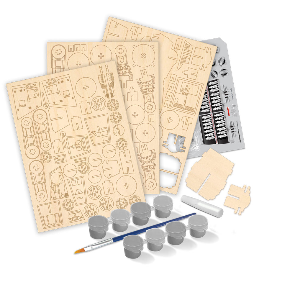 Conține: 90+ piese din lemn taiate cu laser, 8 vase de vopsea, pensula, lipici, foaie de autocolante, instructiuni.