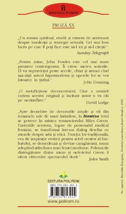 Romanul Mantisa are in centru figura romancierului Miles Green, care, prins in mrejele drogurilor, ajunge in pragul epuizarii fortelor creatoare. Pentru refacere este supus unei terapii sexuale, prilej pentru Fowles de a analiza relatia dintre sexe, dar si de a reflecta asupra conditiei creatorului si a creatiei in general. „Spre deosebire de decorurile ample si vii din romanele sale de mare intindere, in Mantisa totul se petrece in mintea romancierului Miles Green. Fanteziile acestuia, legate de personalul medical feminin, se transforma intr-un dialog deschis cu muzele despre arta si etica. Functia lor traditionala, cea de inspiratie erotica pentru actul creator al barbatului, se demodeaza si devine caraghioasa, muza adoptind atitudinea unei femei moderne. Polemicile distrugatoare dintre muze si nefericitul Green ii ofera cititorului spectacolul dorit.” (Jules Smith)