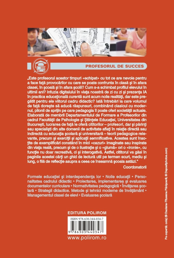 „Este profesorul acestor timpuri «echipat» cu tot ce are nevoie pentru a face față provocărilor cu care se poate confrunta în clasă și în afara clasei, în școală și în afara școlii? Cum s-a schimbat profilul elevului în ultimii ani? Infuzia digitalului în viața noastră de zi cu zi și prezența IA în practica educațională curentă sunt acum noile realități, dar este pregătit pentru ele viitorul cadru didactic? Iată întrebări la care volumul de față dorește să aducă răspunsuri, combinând clasicul cu modernul, pilonii de sprijin pe care pedagogia îi poate oferi societății actuale. Elaborată de membrii Departamentului de Formare a Profesorilor din cadrul Facultății de Psihologie și Științele Educației, Universitatea din București, lucrarea de față le oferă cititorilor – profesori, dar și părinți sau specialiști din alte domenii de activitate aflați în relație directă sau indirectă cu educația școlară și universitară – teorii pedagogice relevante, precum și exerciții și aplicații semnificative. Acestea sunt însoțite de exemplificări constând în mici «cazuri» imaginate sau inspirate din viața reală, precum și de o ilustrație și o «glumă» ori o «ironie», cu funcție nu doar recreativă, ci și interogativă. Astfel, cititorul va găsi în paginile acestei cărți un ghid de lectură util pe termen scurt, mediu și lung, o filă de reflecție asupra a ceea ce înseamnă școala astăzi.” (Coordonatorii)