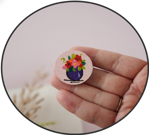 Broșă realizată din placaj(lemn de mesteacăn), pictată manual cu culori acrilice și lăcuită pentru protecție cu lac pe bază de apă.