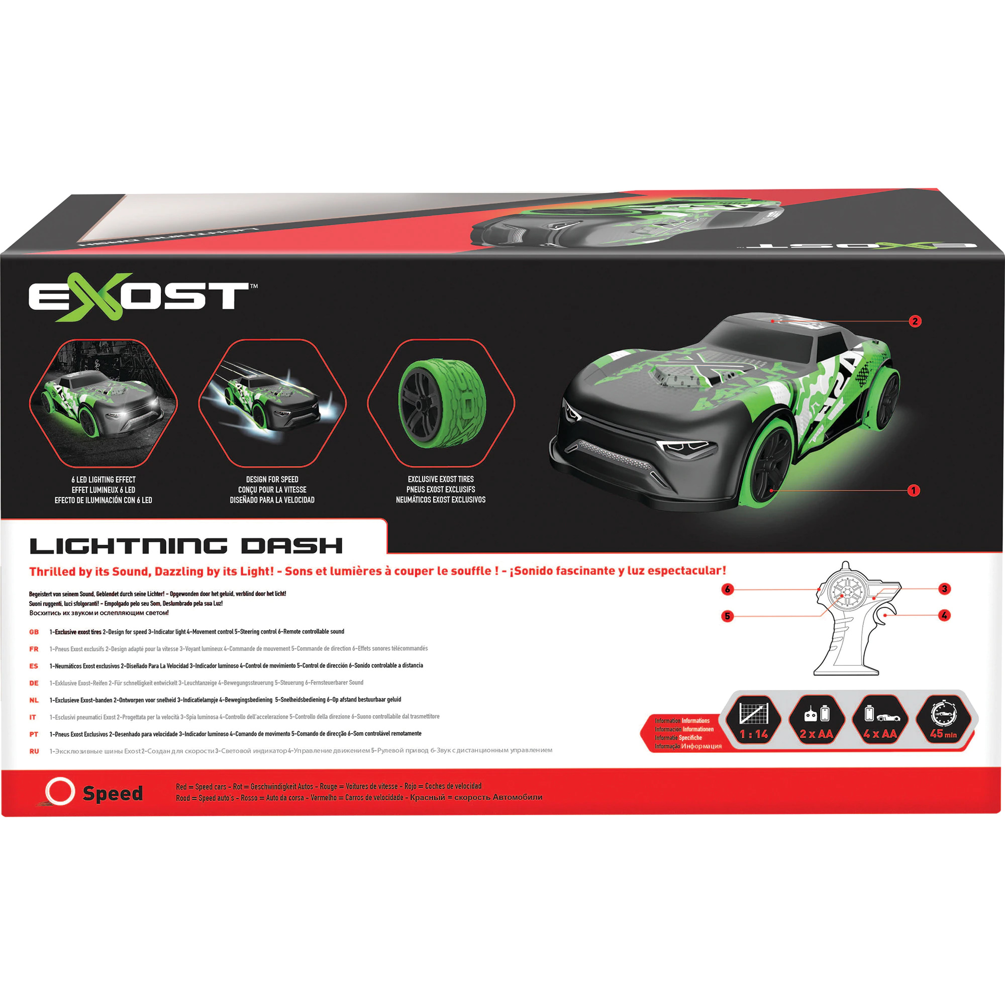 Cu masinuta cu telecomanda Lighting Dash, construita la o scara 114, cu transmisie 2.4 GHz , control deplin al functiilor, cu efecte sonore a motorului si efecte luminoase. Masinuta are 6 luminite LED incorporate, pentru un design urban nou si modern. Rotile durabile, si rezistente marca EXOST. Varsta recomandata 6+. Functioneaza cu baterii Vehicul 4xAA, nu sunt incluse, Telecomanda – 2xAA nu sunt incluse.