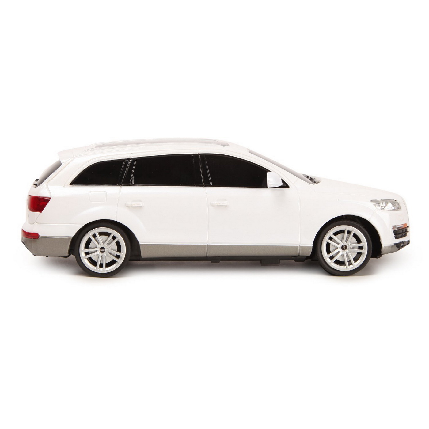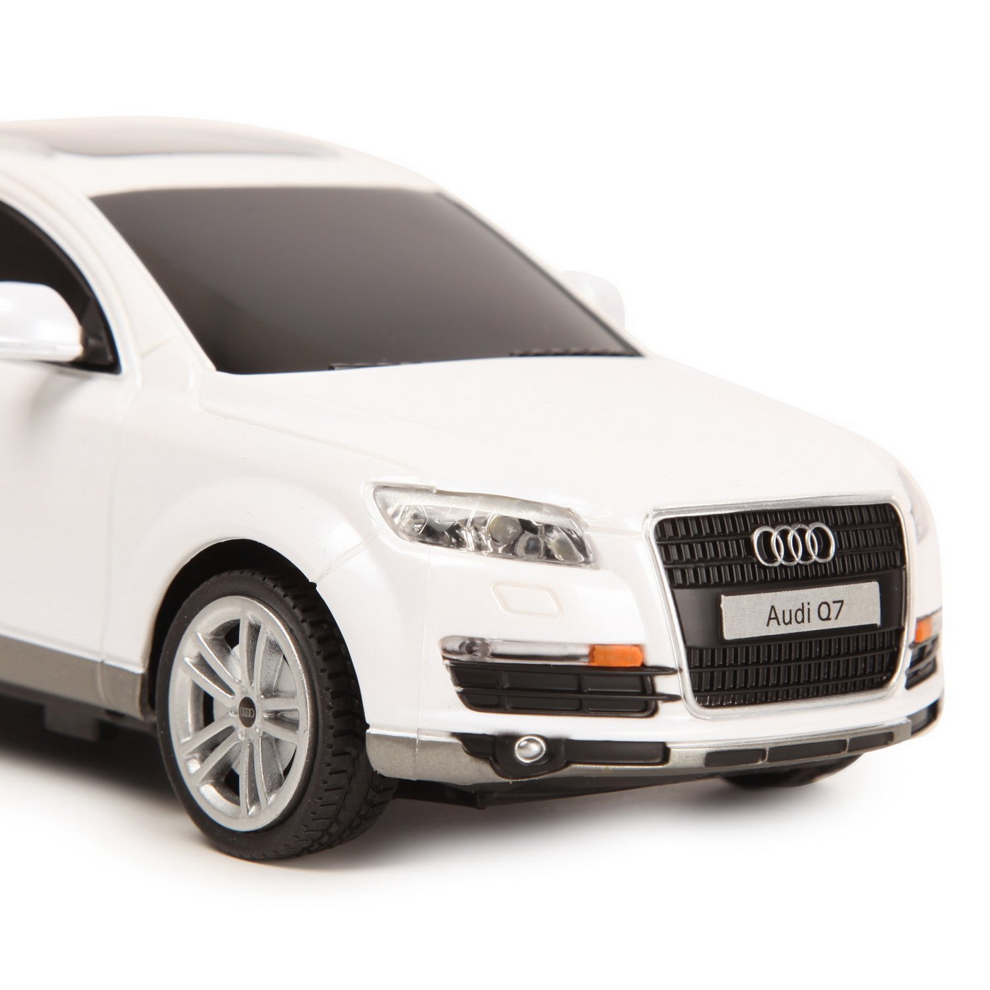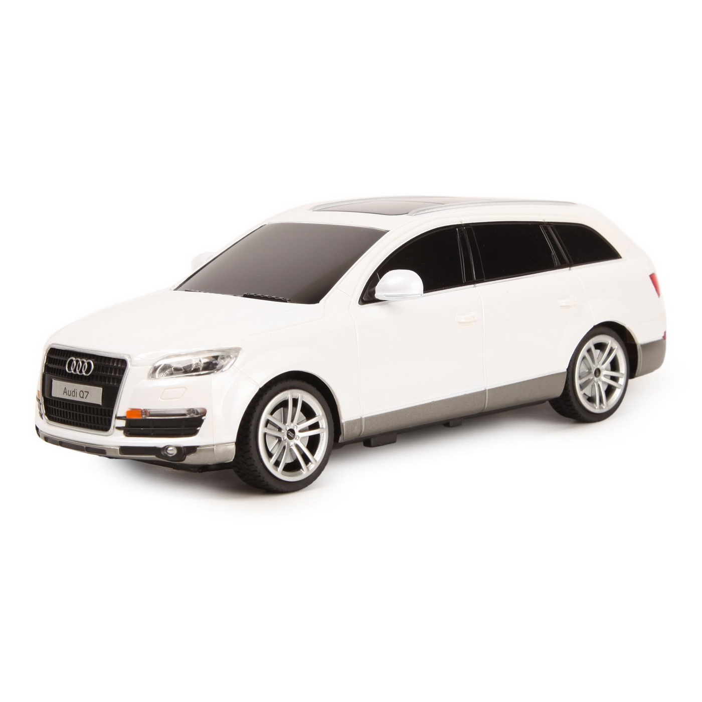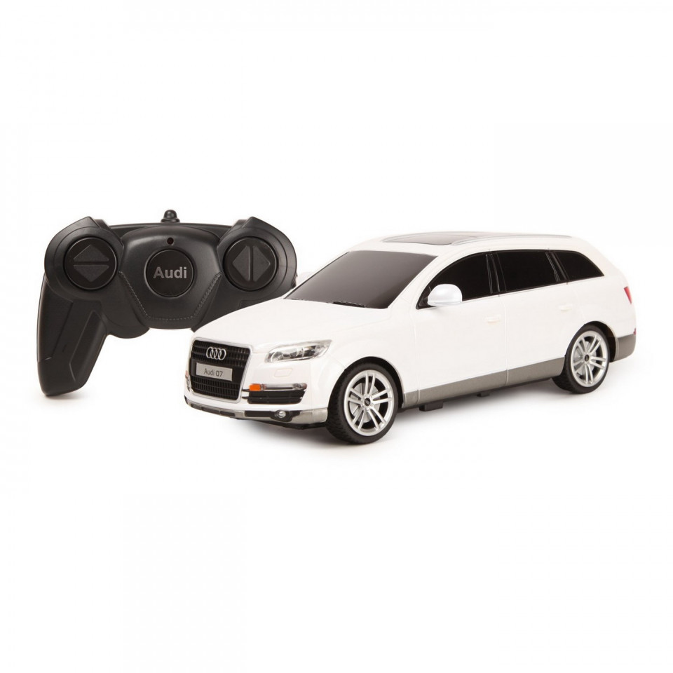 Copilul dumneavoastra se poate juca in voie cu masina cu telecomanda Audi Q7, scara 1 la 24, oferita de brandul international Rastar. Nicio cursa nu este imposibil de castigat cu acesta masinuta, replica oficiala cu licenta a modelului original, construita cu mare atentie la detalii. Masinuta are proportiile ideale pentru momente pline de distractie si amuzament, avand dimensiunile in centimetri dupa cum urmeaza : 18.9*9.2*5.2.Masinuta functioneaza pe frecventa de 2.4G.Alimentarea se face astfel : pentru masinuta sunt necesare 3 baterii tip AA , iar pentru telecomanda 2 tip AA.Masinuta se poate deplasa in toate directiile : inainte, inapoi, stanga sau dreapta. Masina cu telecomanda Audi Q7, scara 1 la 24, poate rula cu o viteza aproximativa de 10km/h, are tractiune 2WD, anvelope de cauciuc, posibilitate de reglaj a directiei direct pe sasiu si o raza de actiune a telecomenzii de circa 20 de metri.