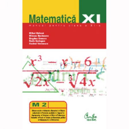 Manualul de Matematica a fost aprobat prin Ordinul MEC nr. 4144 din 18 iulie 2001, anexa 2 la OMEC, pozitia 102, filiera M2: Stiinte sociale, Industrie alimentara, Chimie industriala, Protectia mediului, Agricol, Agromontan, Veterinar, Silvic, Prelucrarea lemnului, Posta, Turism si alimentatie publica, Administrativ, Arhitectura. Manualul contine doua parti: Algebra si geometrie analitica si Analiza matematica (limite, calcul diferential).