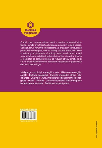 Corpul uman nu este altceva decit o matrice de energii intretesute numite qi in filosofia chineza sau prana in textele vedice. Donna Eden, o renumita vindecatoare, va arata cum sa vizualizati propriul cimp energetic, cum sa stabiliti cauzele afectiunilor fizice si psihice si ce tratamente sa aplicati pentru ameliorarea lor. Veti reusi astfel sa va echilibrati sistemele imunitar, circulator, limfatic si respirator, sa calmati durerea, sa reduceti stresul emotional si sa va imbunatatiti memoria, stimulind capacitatea organismului de a se vindeca singur.