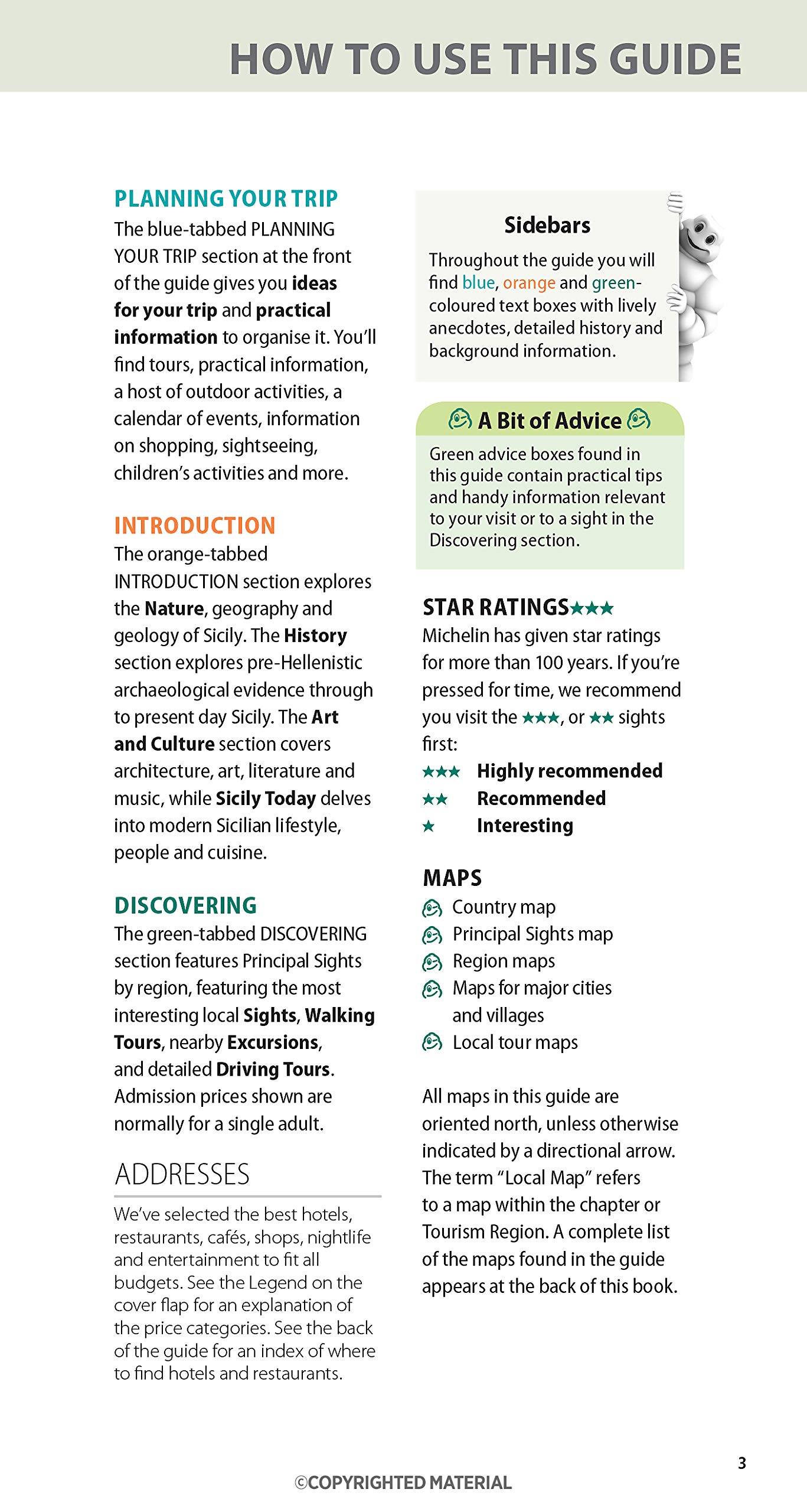See the best of the island with the updated Green Guide Sicily. Shelter from the heat in the maze of columns of Agrigento’s ancient Valle dei Templi; delight in captivating Isole Egadi, stroll through the Palazzo dei Normanni; visit postcard-perfect Taormina. Experience Palermo’s food markets encircled by Arabo-Norman palaces and Baroque churches. Explore Sicily and surrounding satellite isles through walking and driving tours and day-trip ideas – all simple with Michelin’s clear maps, celebrated star-rating system and trusted advice Perfect for travellers seeking enriching experiences and in-depth information on their destination. * Star-rated activities and detailed visitor information * Unique driving & walking tours * Colourful, easy-to-read maps throughout * Lively introductions to the area, its people & culture * Restaurant & hotel tips * Family friendly advice * Walk-through of major museums, galleries, churches and attractions