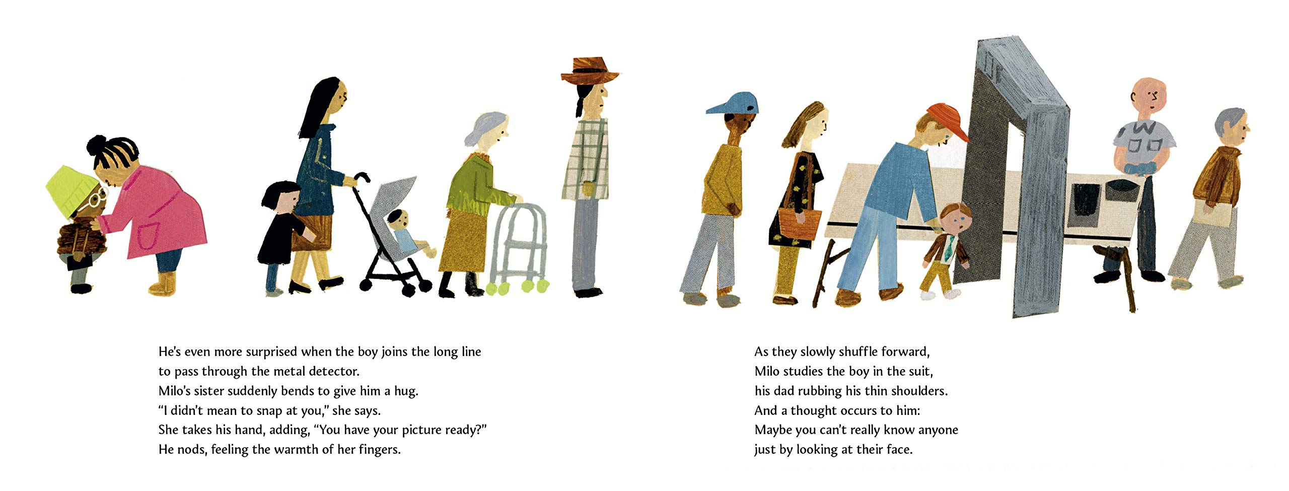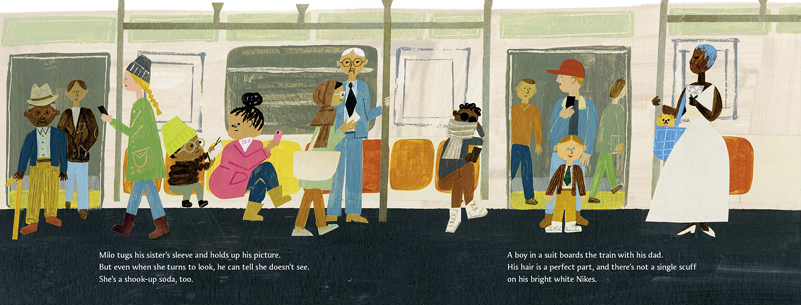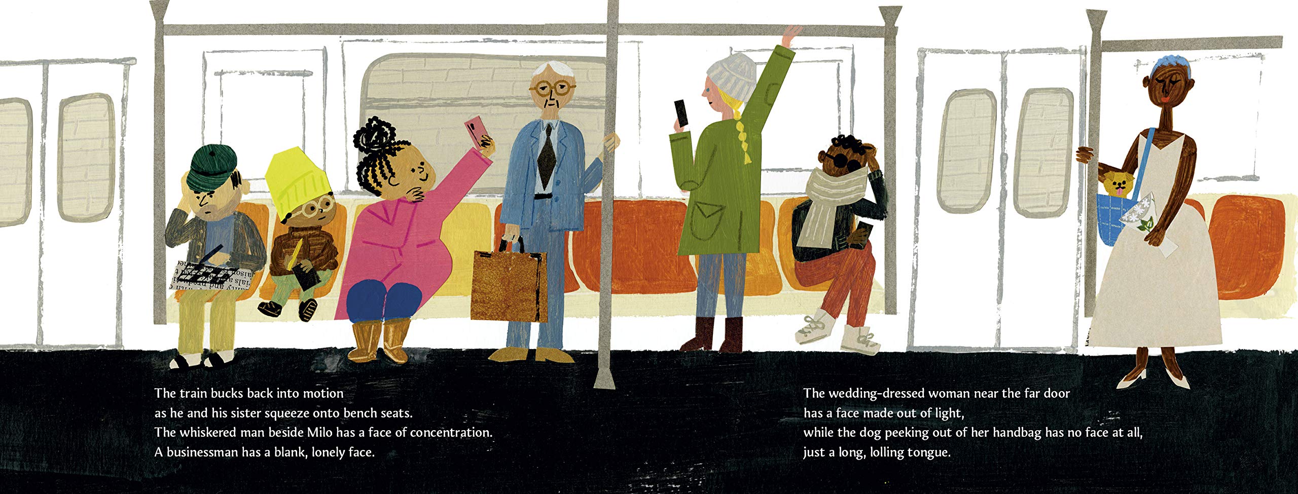 Milo is on a long subway ride with his older sister. To pass the time, he studies the faces around him and makes pictures of their lives. There's the whiskered man with the crossword puzzle; Milo imagines him playing solitaire in a cluttered apartment full of pets. There's the wedding-dressed woman with a little dog peeking out of her handbag; Milo imagines her in a grand cathedral ceremony. And then there's the boy in the suit with the bright white sneakers; Milo imagines him arriving home to a castle with a drawbridge and a butler. But when the boy in the suit gets off on the same stop as Milo - walking the same path, going to the exact same place - Milo realises that you can't really know anyone just by looking at them.