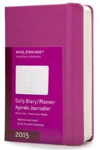 This colourful, pocket-sized 12-month daily 2015 diary features a magenta hard cover with rounded edges. It has 400 thread bound acid-free pages, a matching ribbon bookmark and elastic enclosure. There is an expandable inner magenta fabric pocket which contains a removable address book. There is a new page for each day, offering plenty of space for notes and appointments.