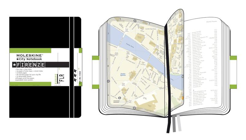The first guidebook you write yourself. The city of Florence takes its name from the word for flourishing”. Many centuries after its founding, the city continues to be a destination for art and culture. Collect your impressions in the Moleskine City Notebook Florence. The Key Map summarizes the overall city layout , showing the sequence and location of the 12 zone maps. Map of the bus system and list of stations, plus the alphabetical street index of the zone maps. Blank pages for jotting down notes and recording your thoughts, stories and memories. 32 removable sheets for loose notes and exchanging messages. 12 translucent sticky sheets for tracing your routes and sharing itineraries. A 96-page tabbed archive for collecting everything that matters most and keeping it at your fingertips. The first 6 tabs are printed the others await your personalization with the enclosed adhesive labels. Each pocket sized Moleskine City Notebook is thread bound and has a cardboard bound cover with rounded corners, acid free paper, three bookmarks, an elastic closure and an expandable inner pocket that contains the Moleskine history.