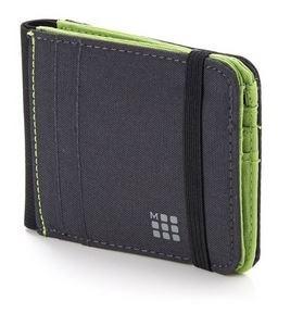 A Moleskine horizontal wallet with reversible format for easy access to all important cards and notes. Made from contrast stitched polyester it has a black elastic band closure and two tone, reversible interior and exterior of Payne's grey and olive green. There are eight horizontal credit card slots and four flat pockets as well as one large cash pocket inside, making it a perfect travelling accessory.