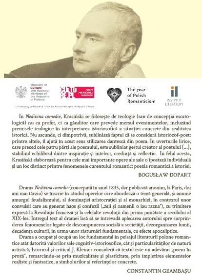 „În Nedivina comedie, Krasiński se folosește de teologie (sau de concepția escatologică) nu ca profet, ci ca gânditor care prevede mersul evenimentelor, incluzând premisele teologice în interpretarea istoriosofică a situației concrete din realitatea istorică. Nu ascunde, ci dimpotrivă, subliniază faptul că se consideră istoriozof-poet: printre altele, îl ajută în acest sens stilizarea dantescă din poem. În uverturile lirice, care preced cele patru părți ale poemului, este subliniat gestul creator al poetului [...], stabilind echilibrul dintre inspirație și intelect, credință și reflecție. În felul acesta, Krasiński elaborează pentru cele mai importante opere ale sale o ipostază individuală și un loc distinct printre fenomenele curentului romantic: poezia romantică a istoriei.” BOGUSŁAW DOPART