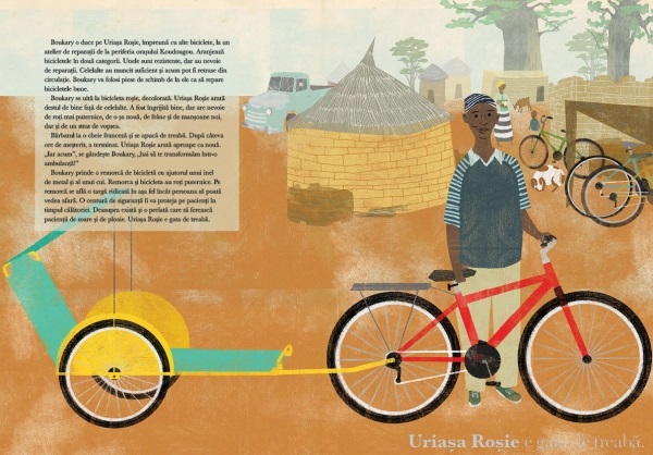 Dar ce nu știe fetița este că Uriașa Roșie a călătorit peste ocean tocmai din America de Nord, unde a aparținut cândva lui Leo. El a mers cu bicicleta roșie peste tot – la școală, la piscină și la antrenamentele de fotbal. Leo s-a simțit trist când bicicleta i-a rămas mică, dar a aflat că o poate dona cuiva care chiar are nevoie de ea. Ajunsă în Burkina Faso, Uriașa Roșie o ajută pe Alisetta să transporte diverse bunuri la piață și să aibă grijă de cultura de sorg a familiei sale. Dar bicicleta roșie mai are o misiune de îndeplinit. Cine o va folosi mai departe? La ce o va folosi?