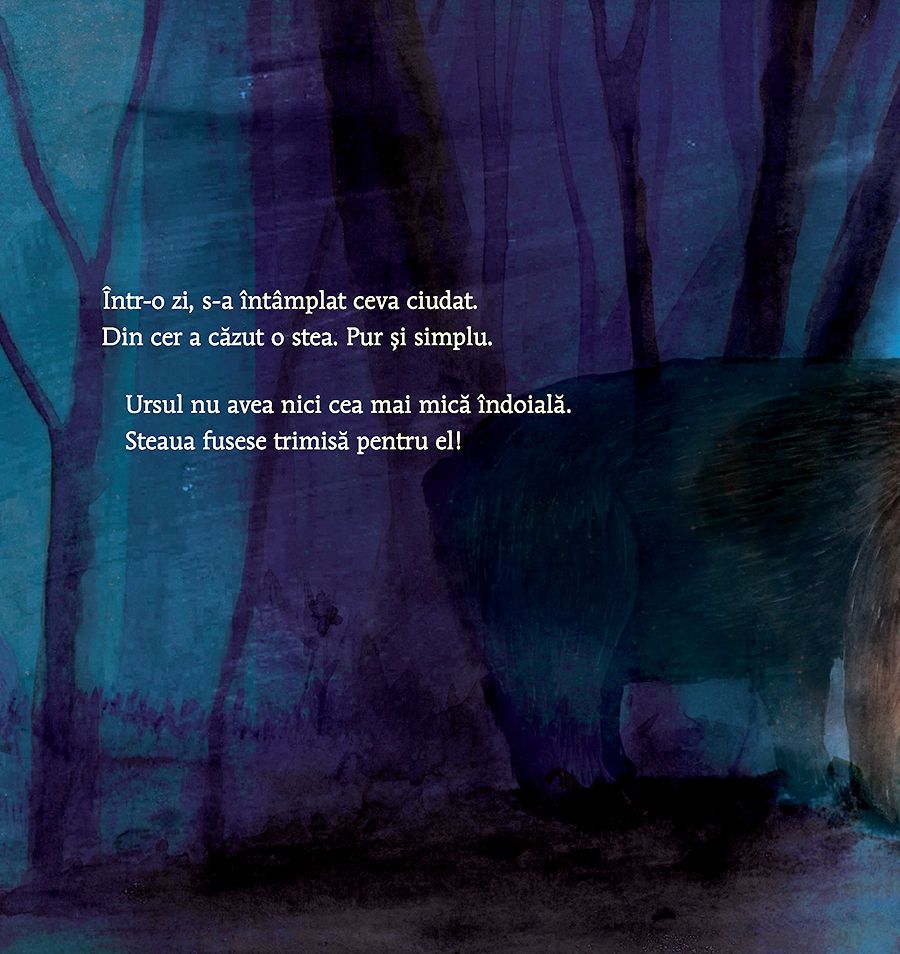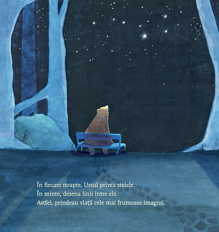 Lucrurile devin mai frumoase atunci când le împărtăşeşti cu ceilalţi. În fiecare noapte, Ursul privea stelele. În minte, desena linii între ele, dând viaţă celor mai frumoase imagini. Când din cer a căzut o stea, Ursul nu a avut nici cea mai mică îndoială: steaua fusese trimisă pentru el!