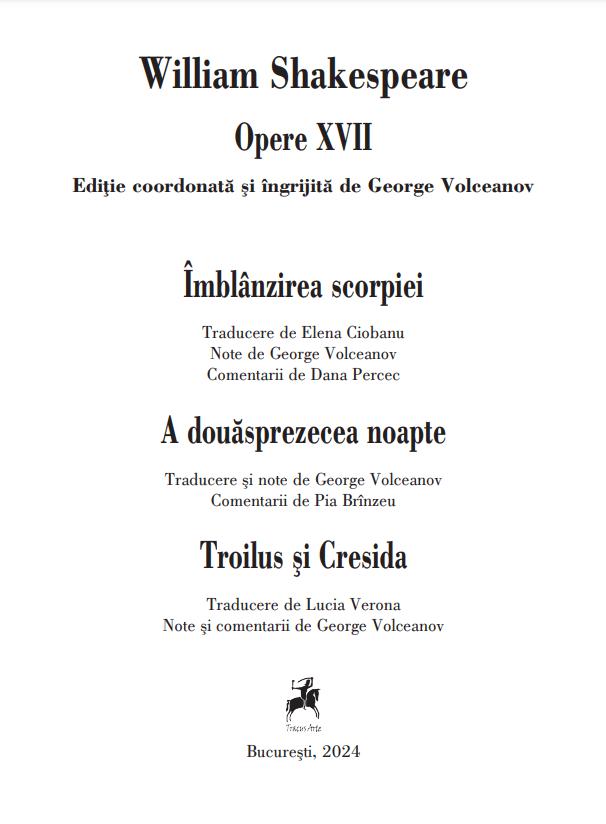 Volumul reunește trei comedii ce ne vor purta în Italia, Ilyria (Dalmația de azi) și legendara cetate a Troiei, iar Caterina, Viola și Cresida ne prezintă trei fațete ale eternului feminin plasate în contexte dintre cele mai diferite, în lumi marcate de interese mercantile, rațiune versus visare, împlinire versus deziluzie; trei piese care ni-l prezintă pe Shakespeare, cum ar spune englezii, at his best.