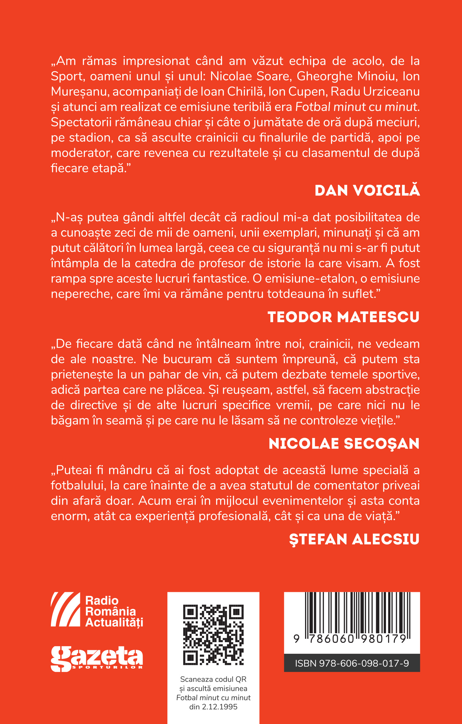 Cititorii vor descoperi in 800 de pagini si numeroase fotografii inedite viața „zeilor microfonului”, conducatori de club, arbitri si jucatori. „Domozina, ai legatura!”, asa incepea Gheorghe Minoiu, coordonatorul emisiunii Fotbal minut cu minut, dupa prezentarea meciurilor ce urmau a fi transmise, trecerea in revista a rezultatelor din Divizia B dar si dupa ce Mircea M. Ionescu dezvaluia „Etapa in cifre si date”. Dincolo de format si de context (unul in care televiziunea nu concura transmisiunile radio la modul la care o face azi), emisiunea Fotbal minut cu minut a fost ce a fost datorita oamenilor care au produs-o, au intretinut-o si au adus-o la cote de performanta si de audienta greu de egalat. Crainicii si-au facut o datorie de onoare din a-si informa ascultatorii la modul cel mai onest posibil, de a-i tine conectati si de a le trimite pe calea undelor tot ce era nevoie pentru a le cultiva sau satisface gustul pentru sportul pur, pentru fotbalul ce era prezentat poate chiar mai frumos decat era. Unele dintre povestile acestor oameni au fost adunate in aceasta carte. Ion Ghitulescu, Sebastian Domozina, Dan Voicila, Octavian Vintila, Nicolae Secosan, Teodor Mateescu, Dan Stefanescu, Vasile Arhire, Dumitru Pelican, Ilie Dobre sau Stefan Alecsiu sunt doar cateva nume din capitolele dedicate ”zeilor microfonului”. Unele amintiri ale lor sunt estompate de trecerea anilor, altele raman de-a pururi vii, dar, adunate, pot reprezenta un tablou ce are foarte multe culori calde si destul de putine terne. Nu de alta, dar in pofida vremurilor politice deloc ofertante, acesti crainici care au construit emisiunea Fotbal minut cu minut au stiut sa scoata in evidenta frumosul si sa se concentreze exclusiv pe lucrurile care ne unesc, nu pe cele care ne dezbina.