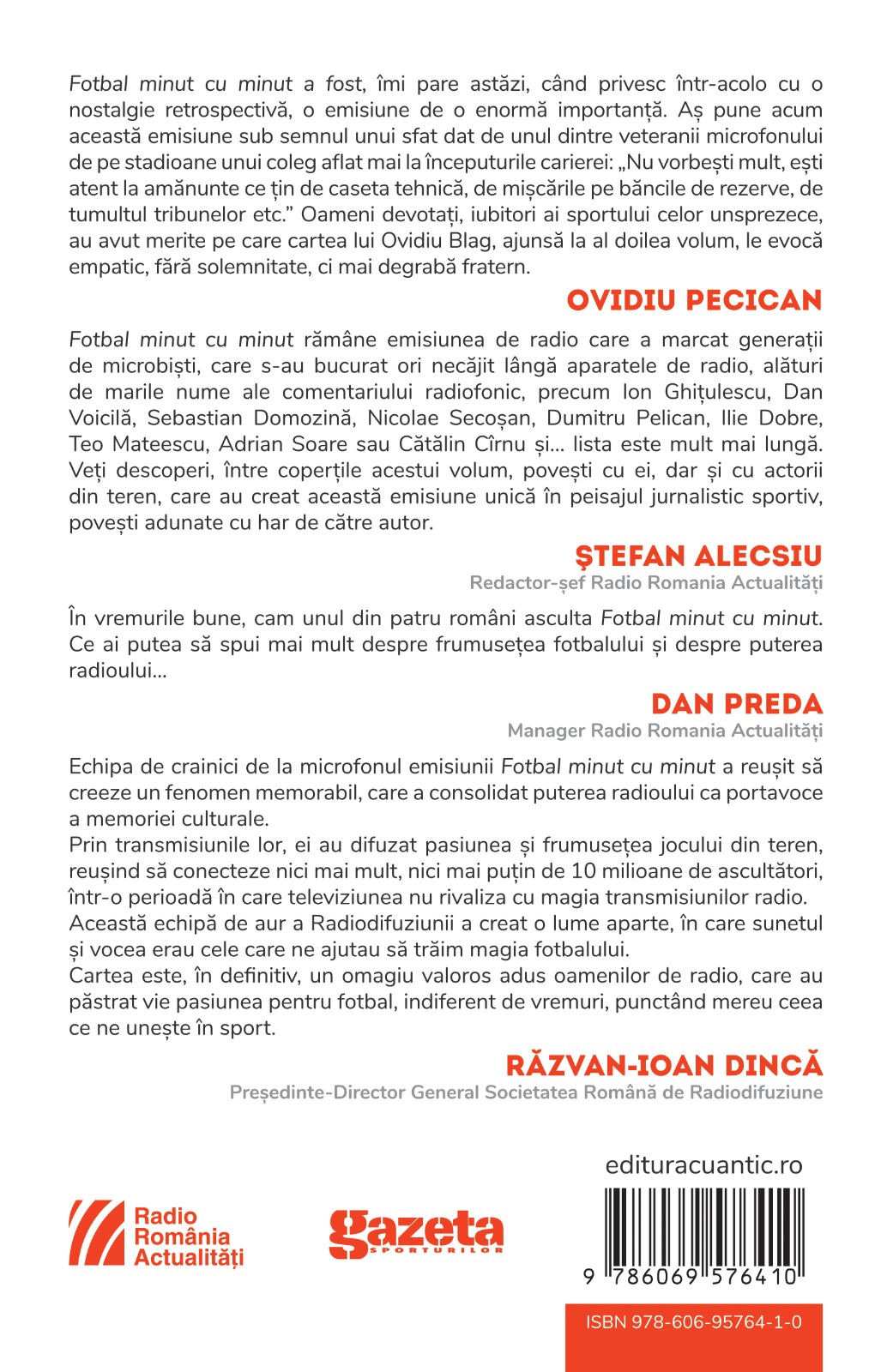 Fotbal minut cu minut a fost o emisiune de o enormă importanță, îmi pare astăzi, când privesc într-acolo cu o nostalgie retrospectivă. Aș pune, astăzi, această emisiune sub semnul unui sfat dat de unul dintre veteranii microfonului de pe stadioane unui coleg aflat mai la începuturile carierei: „Nu vorbești mult, ești atent la amănunte ce țin de caseta tehnică, de mișcările pe băncile de rezervă, de tumultul tribunelor etc.” Oameni devotați, iubitori ai sportului celor unsprezece, au avut merite pe care cartea lui Ovidiu Blag, ajunsă la al doilea volum, îi evocă empatic, fără solemnitate, ci mai degrabă fratern. (Ovidiu Pecican)