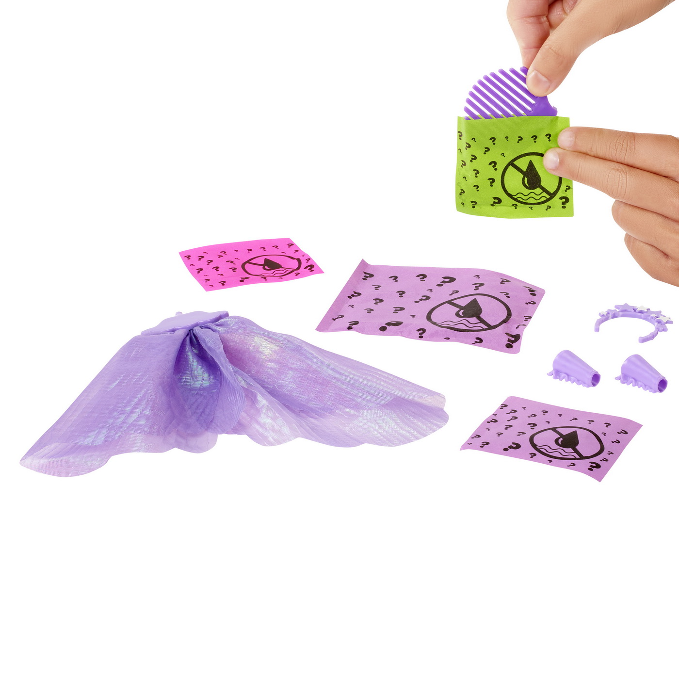 SERIA SIRENE CURCUBEU CU DEZVaLUIRE CU APa, despachetati pentru 7 surprize! Papusile Barbie cu inovatie originala Color Reveal asigura o experienta de despachetare magica plina cu sapte surprize, inclusiv o papusa cu un aspect de sirena misterios, care se dezvaluie cu apa! Ambalajul face parte din distractie. Pentru a descoperi ce papusa se afla in interior, umpleti tubul cu apa calda, scufundati papusa, agitati si… surpriza! Apa devine albastru marin stralucitor, iar cand scoateti papusa, aspectul sau este dezvaluit! Folositi pieptenul burete scoica si apa rece pentru a dezvalui un model unic pe bratele si coada fiecarei papusi. Folosind apa calda si apa rece, copiii pot repeta la nesfarsit momentele WOW de schimbare a culorilor! Deschideti cele patru pungi misterioase pentru tinute si accesorii de sirena surpriza: o aripa moale care se ataseaza la coada sirenei, o pereche de mansete, o coroana sau un colier si piepten burete scoica. Copiii pot construi un curcubeu cu papusile curcubeu Barbie Color Reveal!