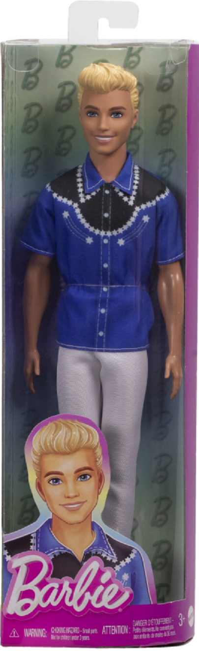 Stilul unic al acestui Ken imprumuta elemente iconicului Western Look, cu un top albastru decorat cu un imprimeu grafic indraznet si pantaloni albi eleganti.