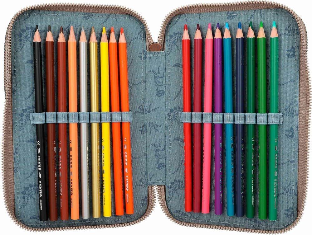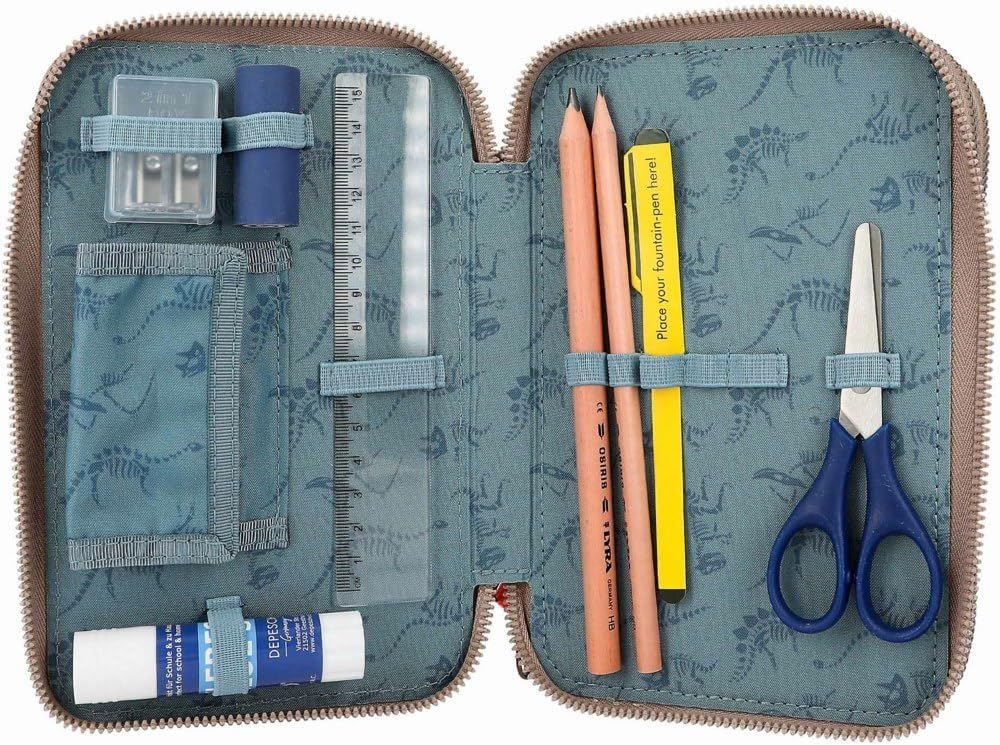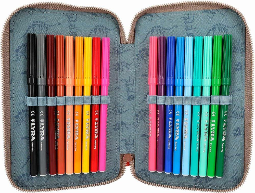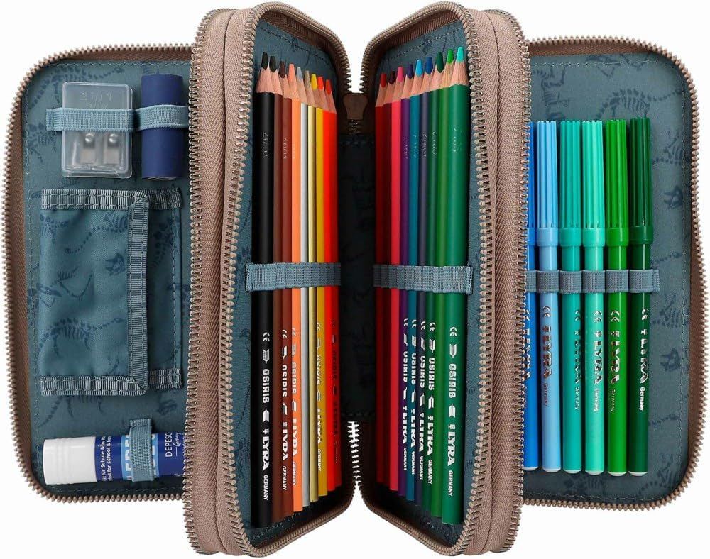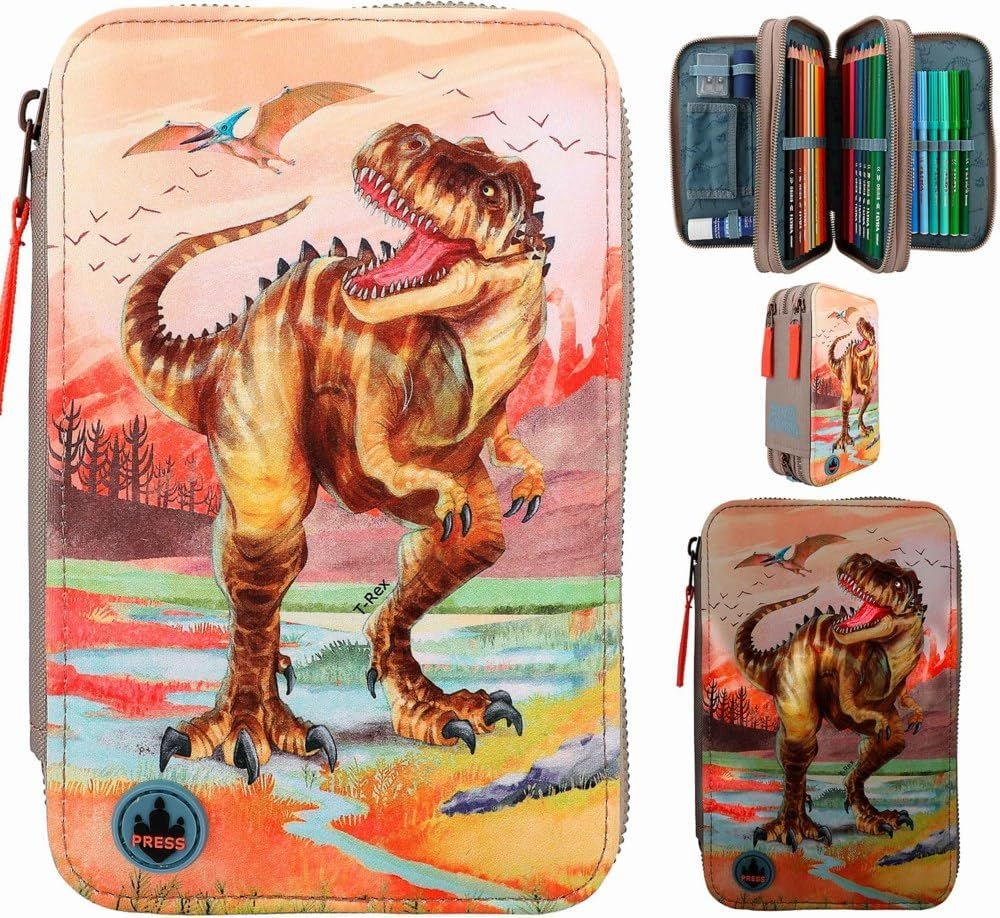 Periculos de misto! Trusa de la Dino World cu T-rex mare și peisaj primordial în nuanțe naturale de pământ își arată secretul de foc la atingerea unui buton: pentru aprox. 20 de secunde, gura și ochiul dinozaurului se luminează unul după altul, la fel ca un craniu amuzant de dinozaur și părți din fundal. Cele trei compartimente separate ale cutiei de creioane sunt complet umplute cu 18 pixuri de colorat și pâslă, 2 creioane, gumă de șters, ascuțitoare, riglă, foarfece, lipici și o mică pungă cu velcro. Bateriile incluse și pot fi înlocuite ulterior.