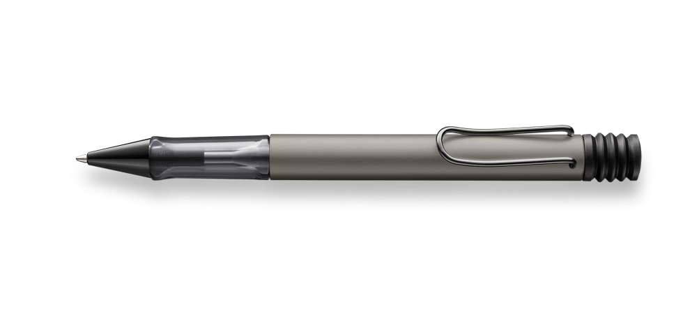 Detalii pix cu mecanism Lamy Lx ruthenium: aluminiu anodizat în culoarea ruthenium / clip metalic și detalii ruthenium / grip ergonomic transparent / rezervă pix Lamy M16 M black / cutie metalică