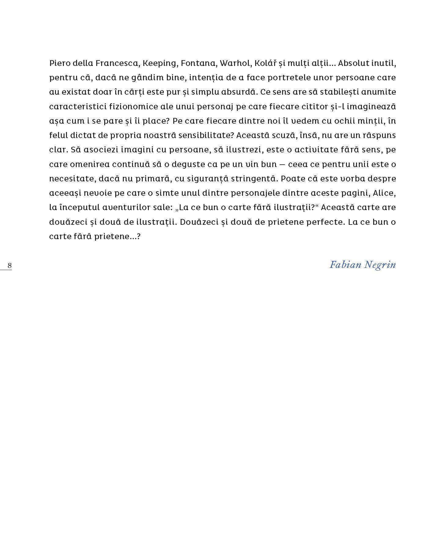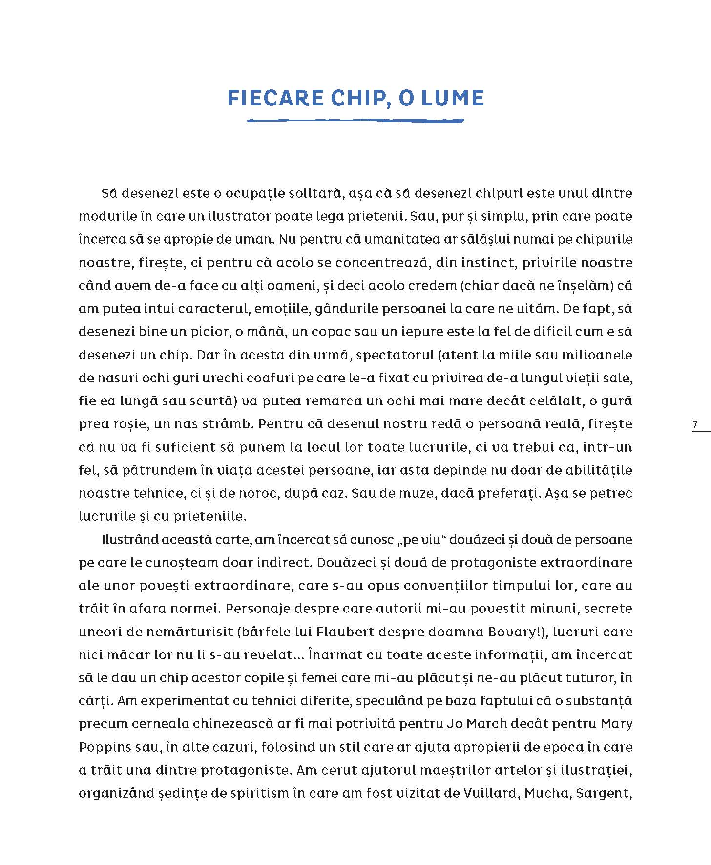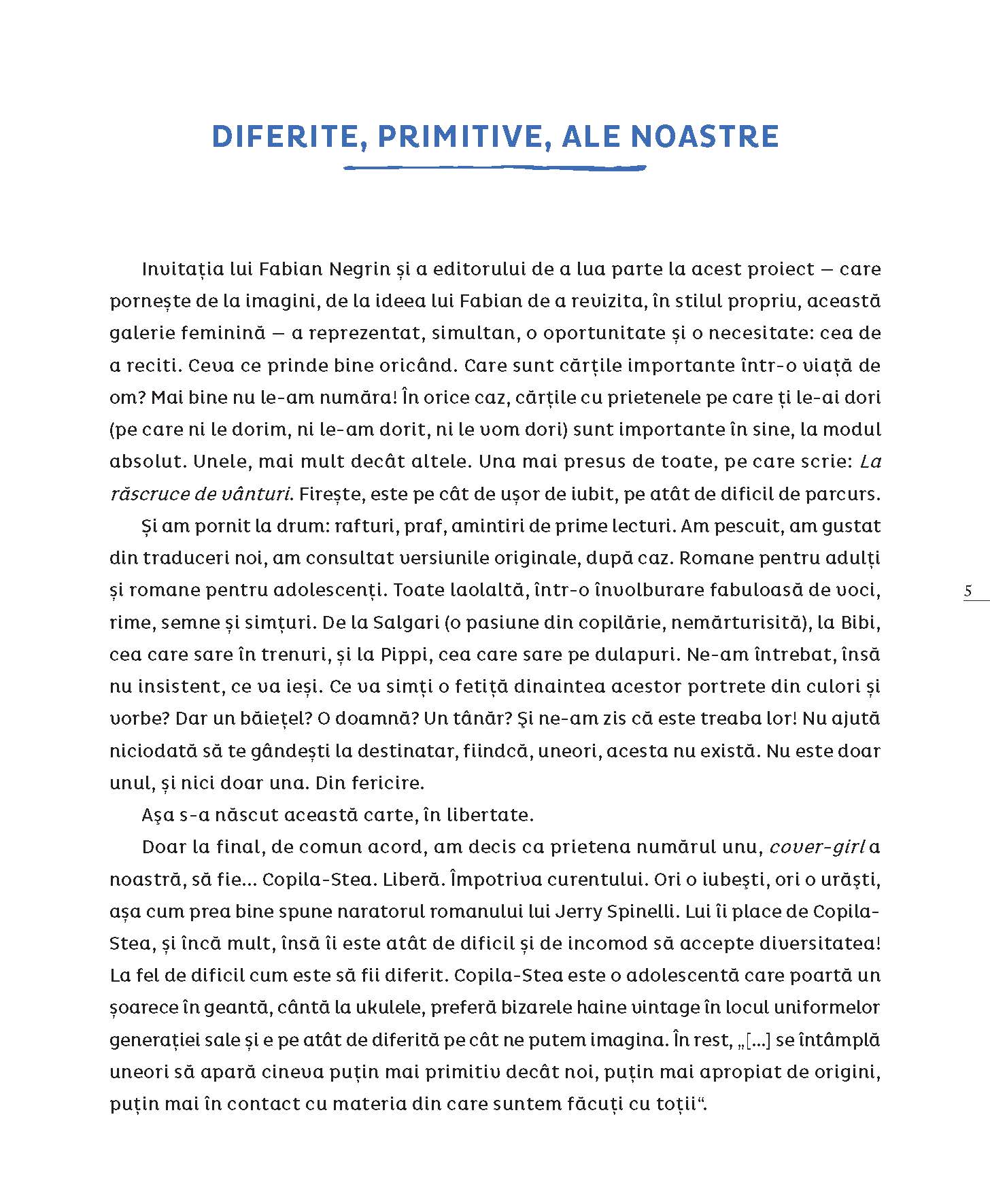 Un îndrumar de lectură pentru tinerele cititoare, încântător ilustrat de către Fabian Negrin. 22 de portrete de protagoniste ale unor cărți celebre de ieri și de azi – de la Emma Bovary la Jane Eyre, de la Lady Chatterley la Anna Karenina, de la Jo la Pippi Șosețica, de la Șeherezada la Matilda lui Roald Dahl – ce au în comun caracteristica de a fi refuzat să se încadreze în normele impuse de societate. Fetițe, adolescente, femei extraordinare, fiecare în felul său.