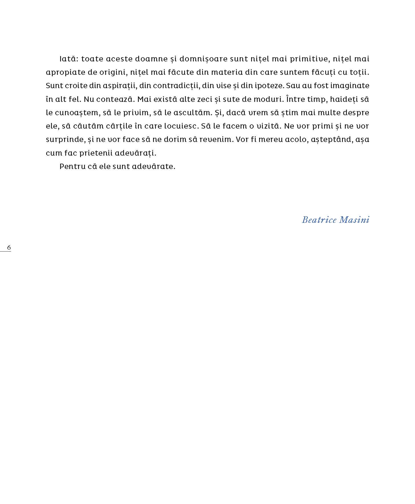 Fiecărei eroine îi este dedicat un pasaj evocativ emoționant, prin intermediul căruia autoarea Beatrice Masini împărtășește cu tinerele cititoare emoțiile și temele pe care fiecare personaj le reunește, deschizându-le astfel apetitul pentru lectură.