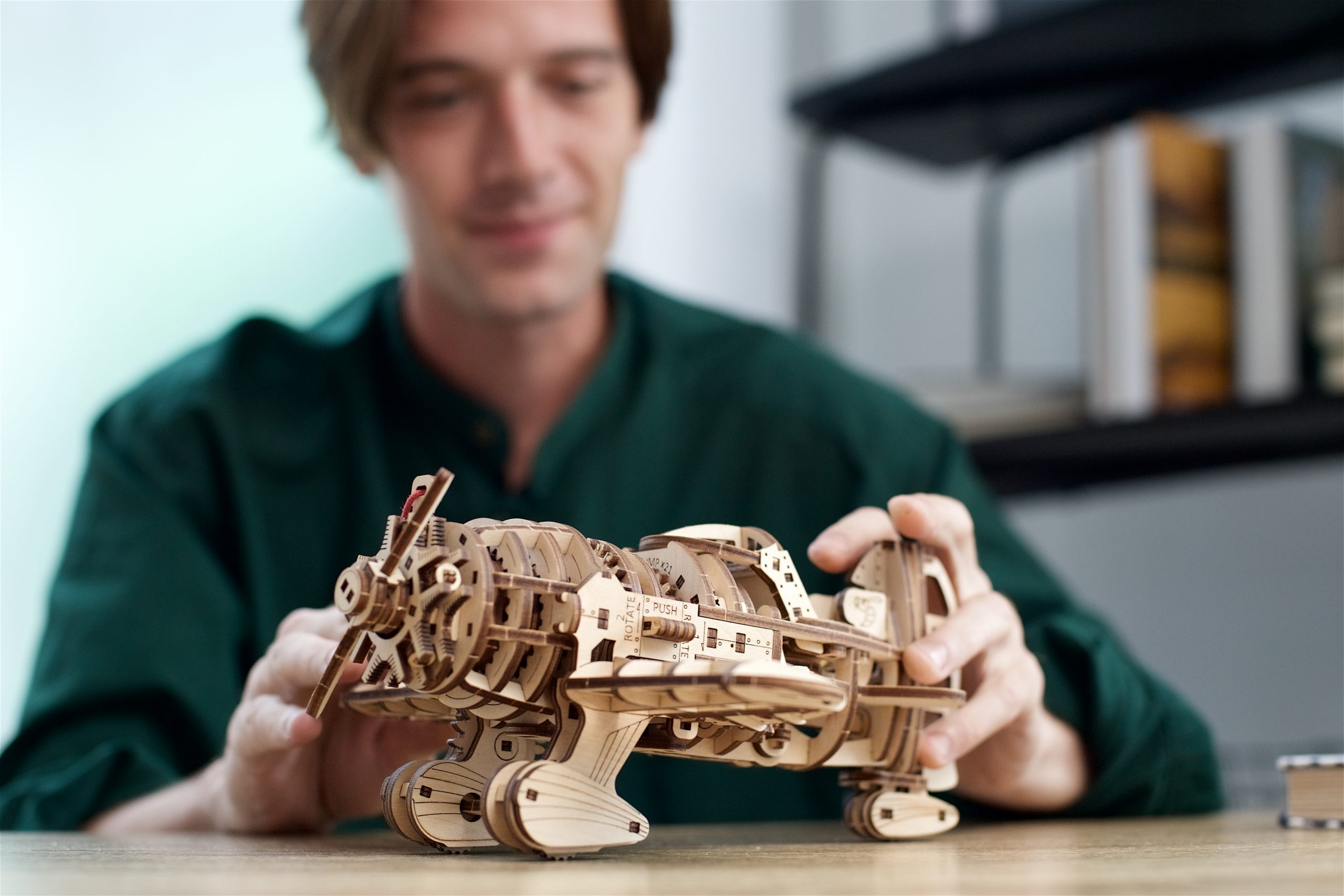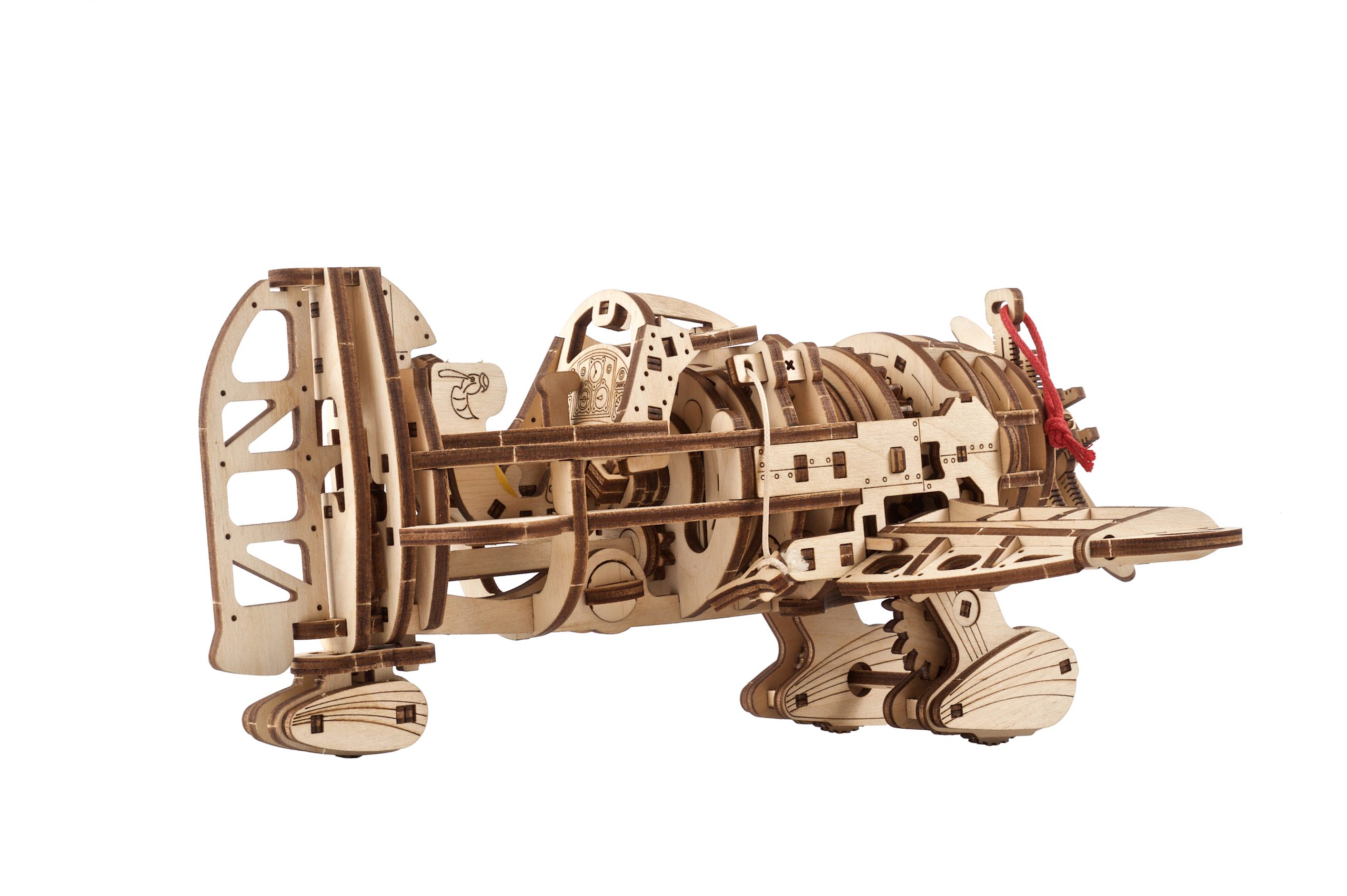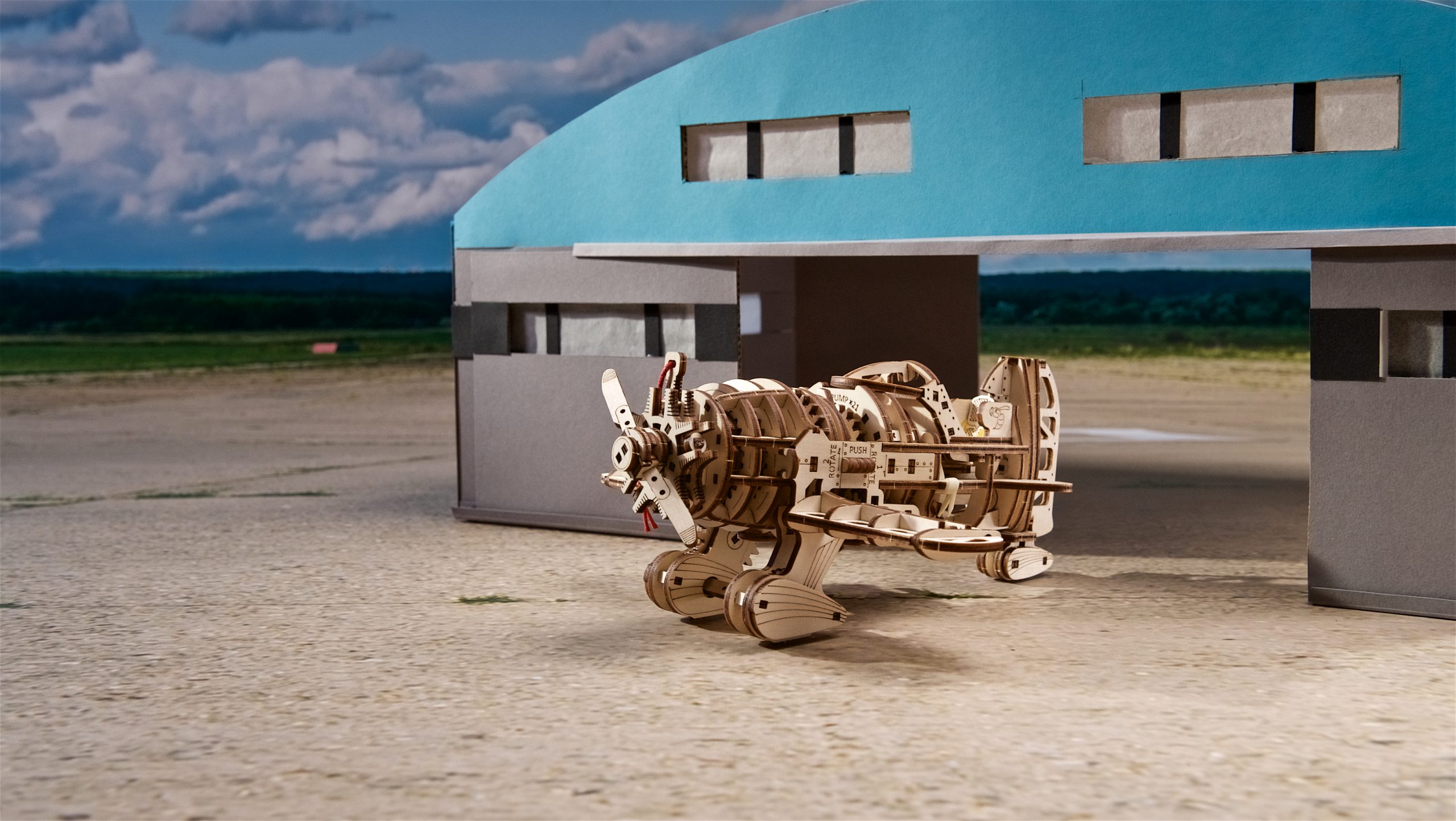Modelul Mad Hornet Airplane de la Ugears este evaluat cu gradul de dificultate „Mediu”, având 354 de piese și oferind peste 8 ore de distracție în timpul asamblării. Modelul este alimentat de un motor cu arc elicoidal, adesea utilizat în mecanismele ceasurilor și alte instrumente de precizie. Diferite seturi de unelte transmit puterea de la arc la piesele mobile ale aeronavei. Mad Hornet dispune de două moduri: check mode și taxi mode. Alegeți modul prin setarea tamburului rotativ într-una din cele două poziții. Introduceți cheia specială în slotul opritorului și trageți de aproximativ 21 de ori. Așezați modelul pe o suprafață plană, apoi scoateți cheia și priviți cum modelul dumneavoastră prinde viață. În check mode, elicea se învârte, în timp ce aripile și coada avionului se mișcă, înainte ca aeronava să treacă în taxi mode. În taxi mode, aeronava începe să zboare imediat, călătorind până la 2,5 metri!