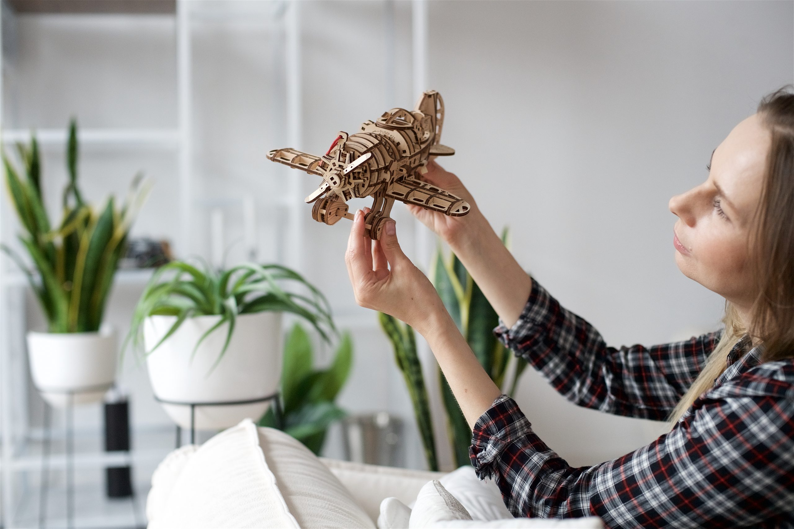 Brand-ul Ugears este cunoscut în întreaga lume pentru producerea de modele frumoase DYI din lemn și puzzle-uri 3D, inclusiv toate tipurile de vehicule – autoturisme, camioane, motociclete, trenuri, bărci și avioane. Mad Hornet este cel mai frumos și mai complex model de până acum, fiind un obiect decorativ perfect pentru locuințe sau birouri.