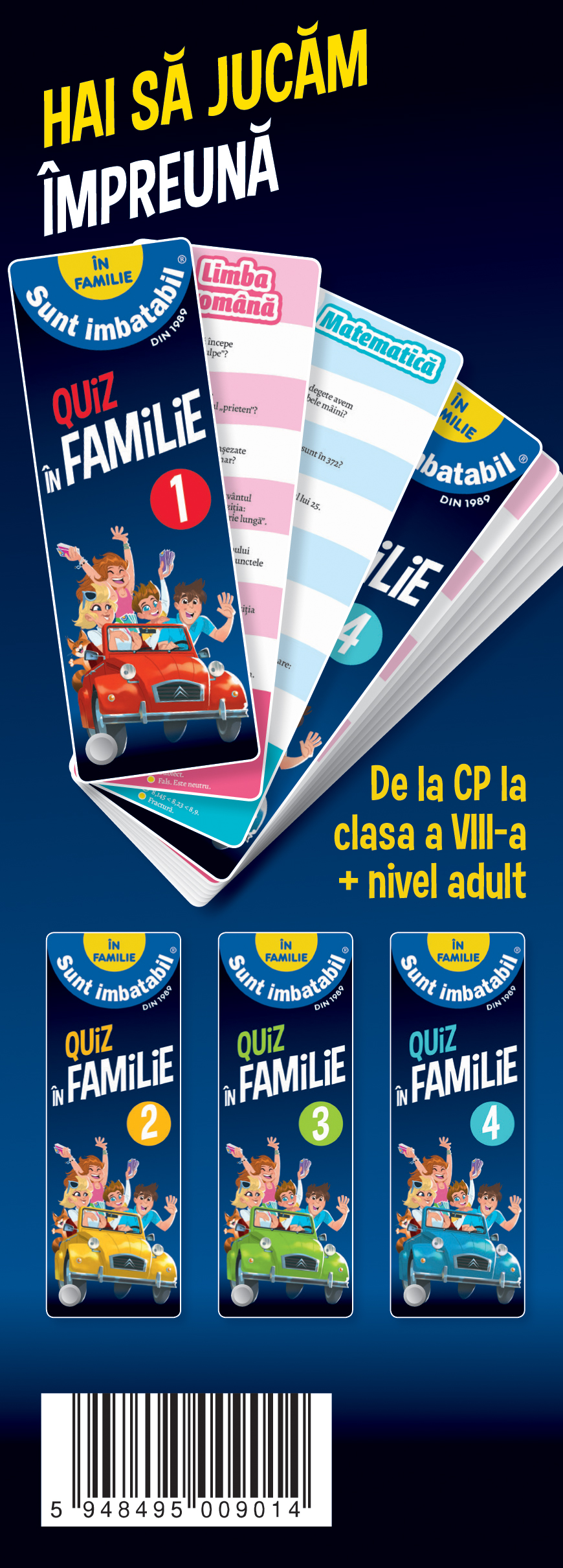 Sunt imbatabil – Quiz în familie este un joc educativ, un instrument indispensabil pentru părinți și copii, destinat pentru a îmbogăți cunoștințele într-un mod distractiv și competitiv. Jocul este cunoscut pentru formatul său interactiv și educativ, ideal pentru a fi jucat în grupuri sau în familie, fie acasă, fie în timpul călătoriilor.