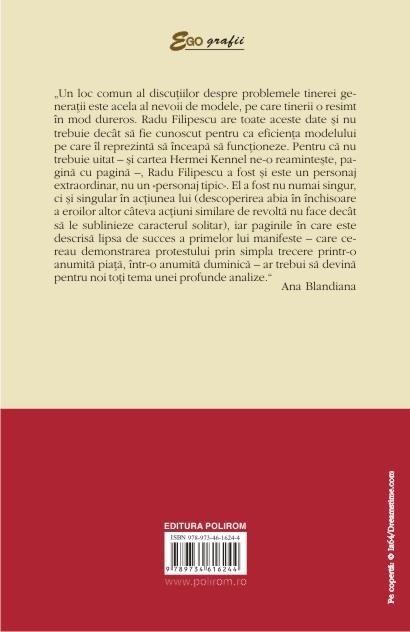 „Un loc comun al discutiilor despre problemele tinerei generatii este acela al nevoii de modele, pe care tinerii o resimt in mod dureros. Radu Filipescu are toate aceste date si nu trebuie decit sa fie cunoscut pentru ca eficienta modelului pe care il reprezinta sa inceapa sa functioneze. Pentru ca nu trebuie uitat – si cartea Hermei Kennel ne-o reaminteste, pagina cu pagina –, Radu Filipescu a fost si este un personaj extraordinar, nu un «personaj tipic». El a fost nu numai singur, ci si singular in actiunea lui (descoperirea abia in inchisoare a eroilor altor citeva actiuni similare de revolta nu face decit sa le sublinieze caracterul solitar), iar paginile in care este descrisa lipsa de succes a primelor lui manifeste – care cereau demonstrarea protestului prin simpla trecere printr-o anumita piata, intr-o anumita duminica – ar trebui sa devina pentru noi toti tema unei profunde analize.” (Ana Blandiana)