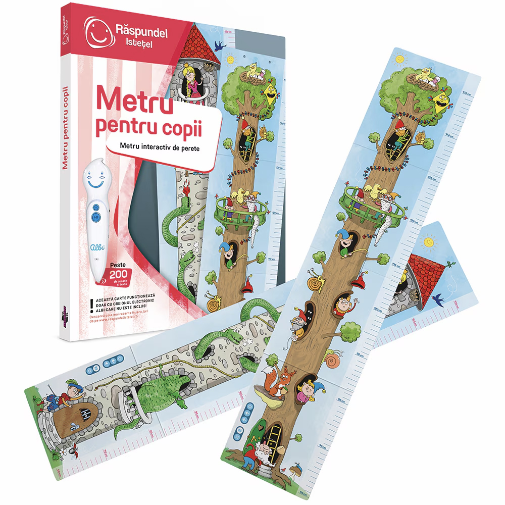 Metrul de perete cu doua fete nu doar ca masoara inaltimea copiilor, ci le face cunostinta si cu lumea basmelor. Pe o parte, ei vor fi fascinati de printul care salveaza printesa si balaurul din ghearele maleficului cavaler Bastian cel Teribil si, pe cealalta parte, de un copac locuit de spiridusi. Ce personaje ii vor insoti pe copiii depinde doar de ei.