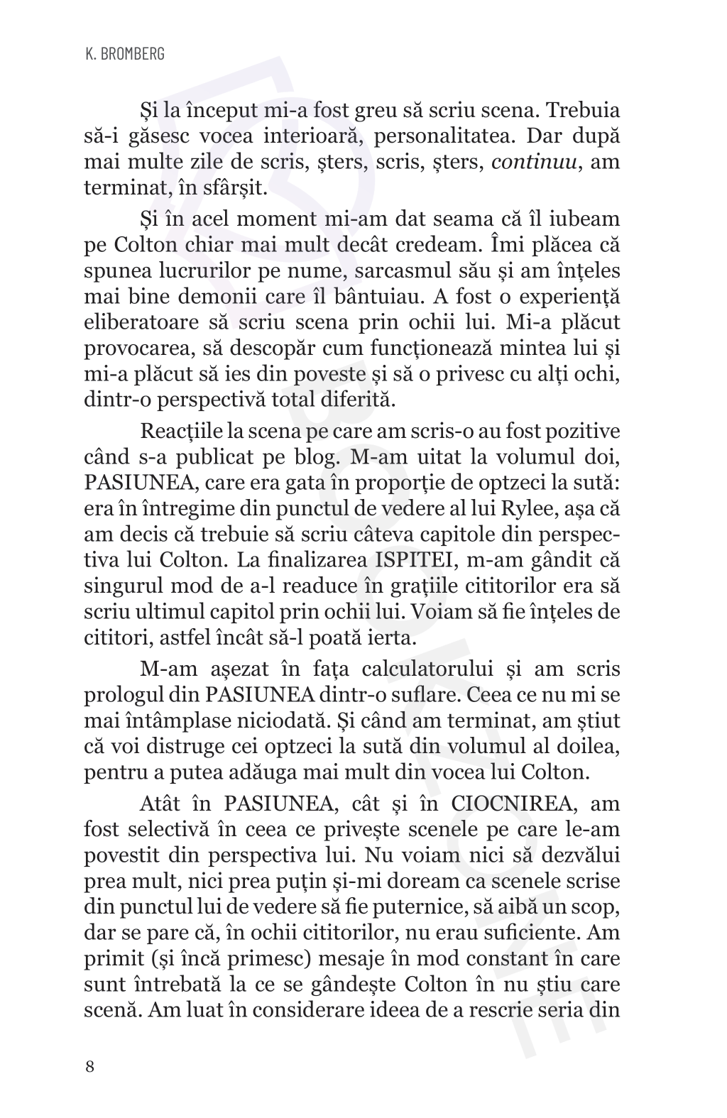 Scrisă la cererea cititorilor, Răsturnarea completează primele trei volume ale seriei #Driven, oferind fanilor șansa de a privi unele dintre momentele-cheie ale relației dintre Colton și Rylee prin ochii lui nespus de verzi. În încercarea de a reda cât mai realist punctul de vedere al eroului, K. Bromberg a inclus în acest volum atât scene regândite și rescrise din volumele anterioare, cât și capitole absolut noi, care dezvăluie fațete neştiute ale personajului.