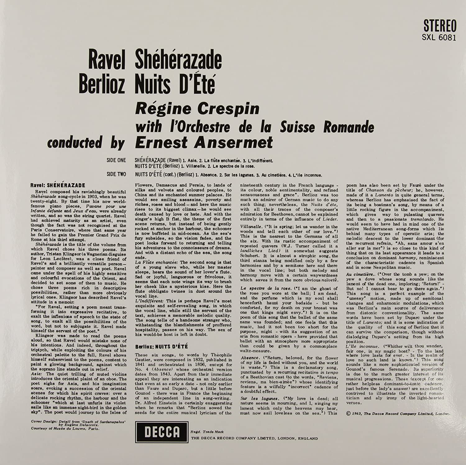 At the time when Ravel set down Sheherazade, and although he had already composed such works as Pavane pour une Infante defunte and Jeux d'eau, - regarded today as excellent - the young composer was still struggling for recognition. Five times he tried to win the prestigious Prix de Rome, France's highest musical award, but barely achieved more than limited acclaim. Ravel's provocative assertion that he didn't follow any particular musical direction, but was an anarchist is reflected in his free, wonderfully interwoven composition Sheherazade. A touch of the Orient is entwined with late-romantic harmony and an impressionistic, modern brilliance, whose depth calls for and merits repeated listening. Ravel shares the lot of a misunderstood genius with Hector Berlioz. Written in 1832, his cycle Les Nuits d'Ete, with its pulsating and arietta-like but also morbid and ghostly songs, provide a wonderful example of a composition from the French Romantic era. The present superb performance was highly acclaimed by producer and author G.A. Eckle, who stated "Regine Crespin is the embodiment of quality when it comes to French repertoire in her category". Features: * 180g Vinyl Musicians: L'Orchestre De La Suisse Romande Ernest Ansermet, conductor Selections: Maurice Ravel Sheherazade Hector Berlioz Les Nuits d'Ete Recorded September 1963 at Victoria Hall, Geneva, Switzerland.