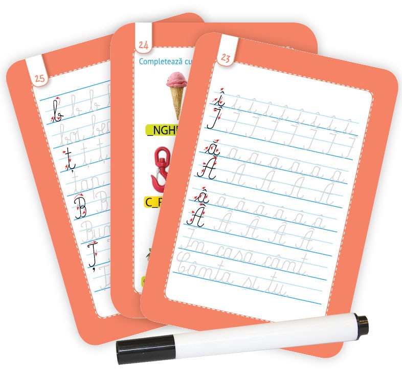 Cardurile Scrie și Șterge sub forma fișelor de lucru ajută copilul să scrie corect literele de mână și, apoi, cuvinte și propoziții simple. Trasarea liniilor după model îl va ajuta pe copil să scrie mai repede și, implicit, să scrie mai ușor, progresând catre caligrafie.