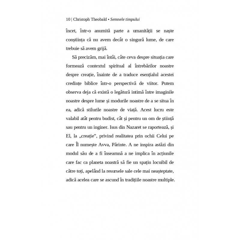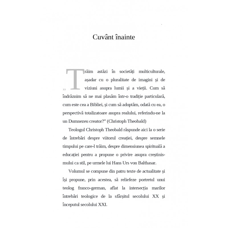 Trăim astăzi în societăți multiculturale, așadar cu o pluralitate de imagini și de viziuni asupra lumii și a vieții. Cum să îndrăznim să ne mai plasăm într-o tradiție particulară, cum este cea a Bibliei, și cum să adoptăm, odată cu ea, o perspectivă totalizatoare asupra realului, referindu-ne la un Dumnezeu creator? -- Christoph Theobald