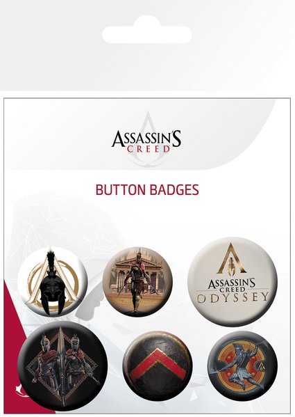 Set 6 insigne - Assassins Creed Odyssey, din aluminiu, include 4 insigne cu dimensiuni: 4 x 2.5 cm, si 2 insigne cu dimensiunile 3.2 x 2 cm.