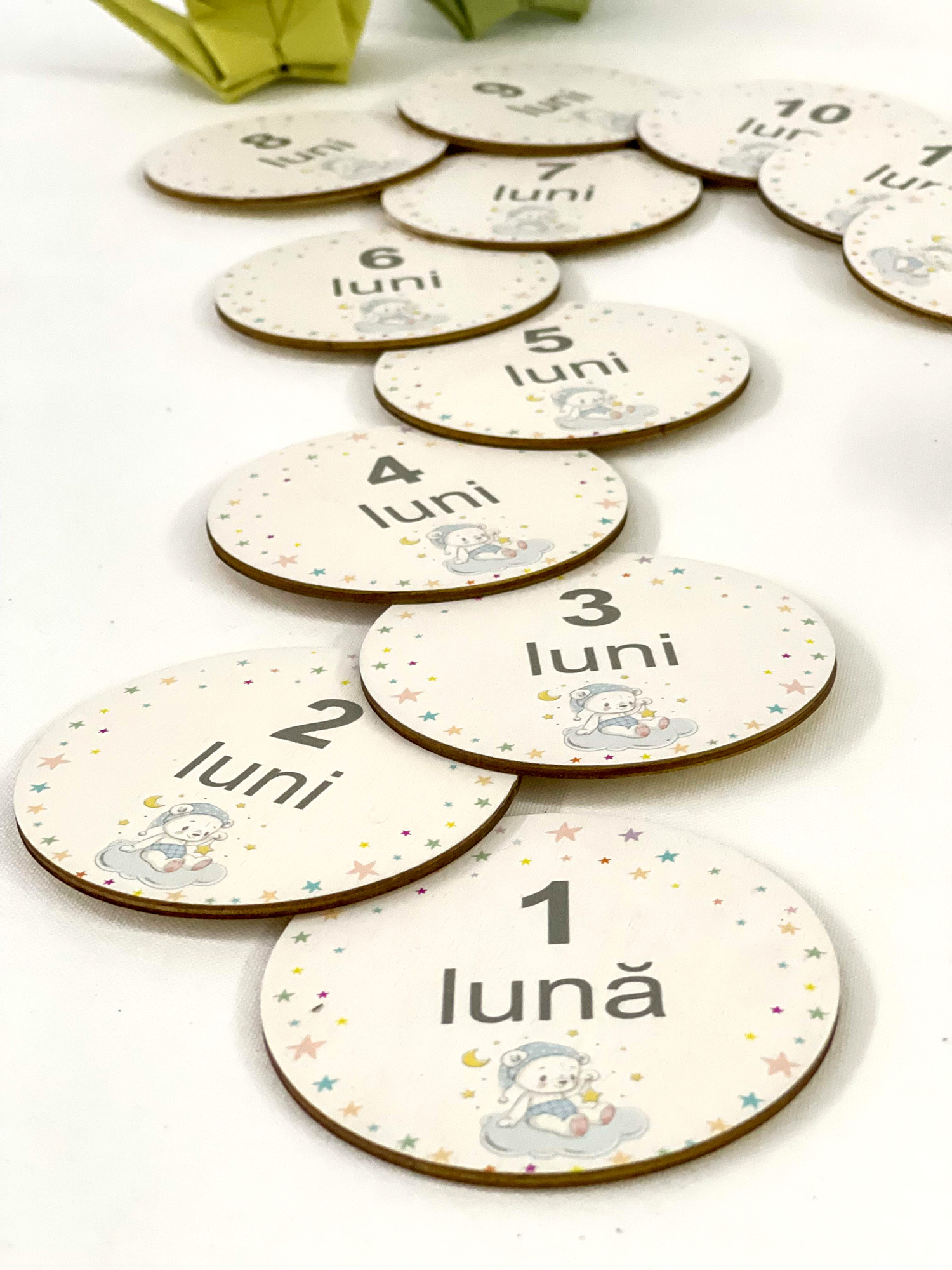 Pentru asta am realizat un set format din 13 placute de lemn, printate cu o grafica adorabila si un ursulet de plus care sa ii stea alaturi bebelusului luna de luna la fiecare poza – ursuletul ramane neschimbat, bebe creste incredibil de repede.