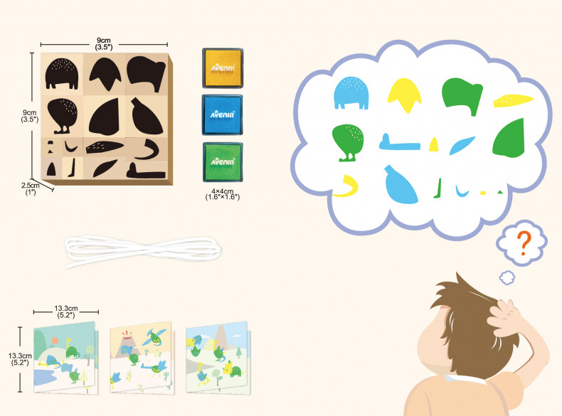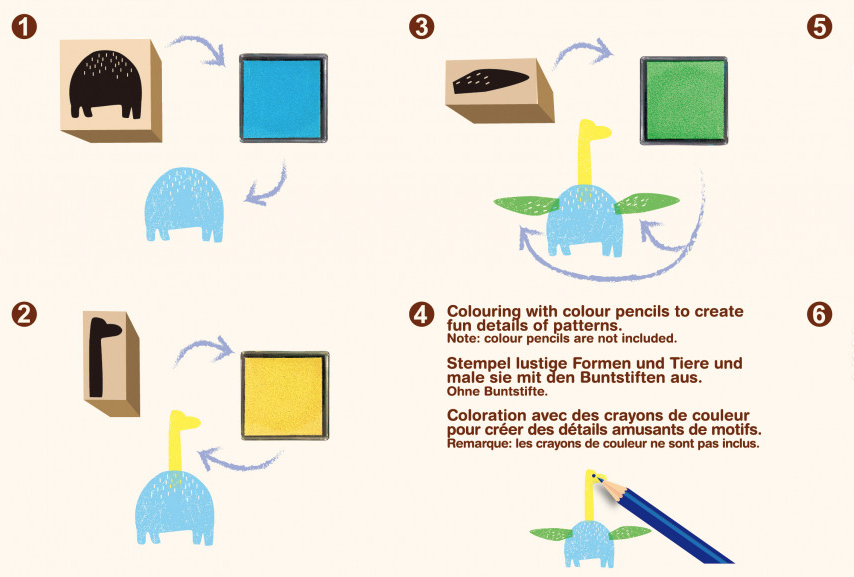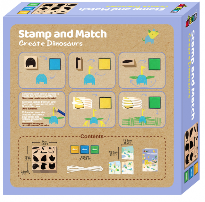 Setul Avenir Stamp & Match Dinosaur cuprinde 15 ștampile din lemn și trei tușiere de cerneală de culori diferite - tot ce ai nevoie pentru a-ți crea proprii dinozauri!